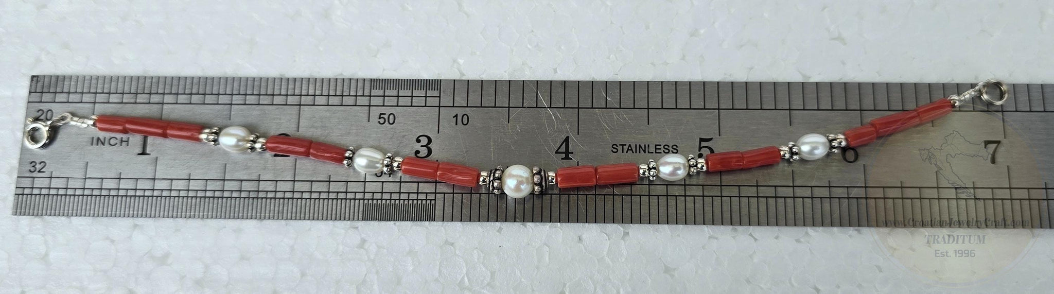 ★ Bracelet made from natural Mediterranean coral in combination with white freshwater pearl. The coral is unique, all natural and hasn't been treated or dyed in any way. All visible metal elements are made of solid sterling silver. Bracelet is strung on a strong and flexible nylon-coated beading wire. ★