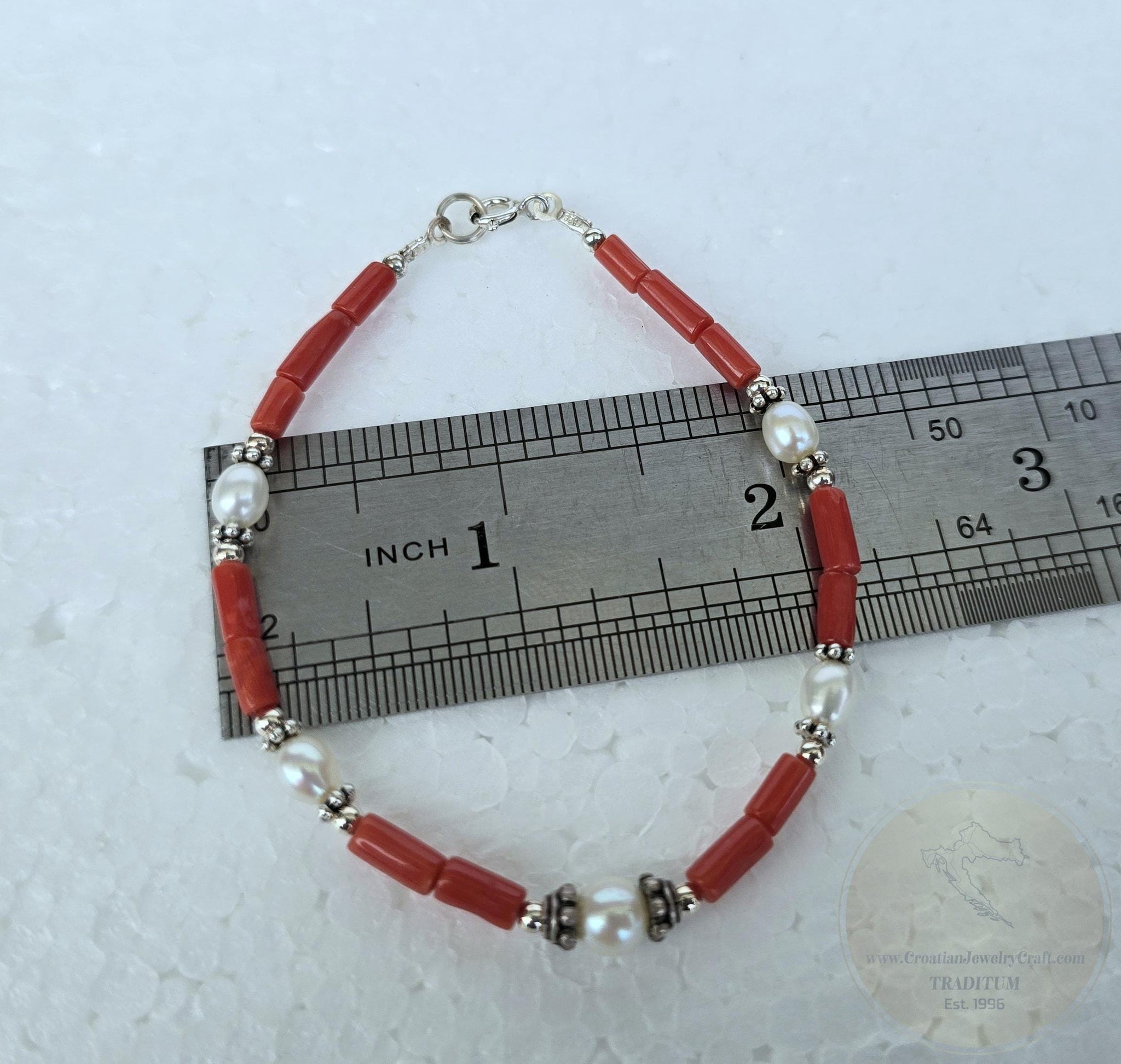 Small Bead Red Coral Bracelet, White Pearl Bracelet, Mediterranean Coral, Sterling Silver Natural Coral Jewelry, Handmade in Croatia