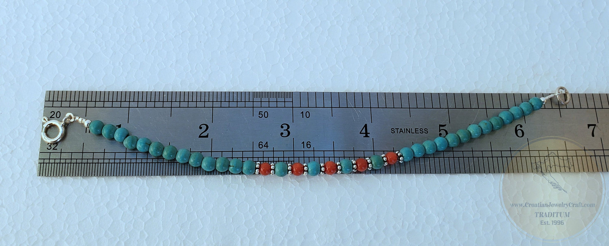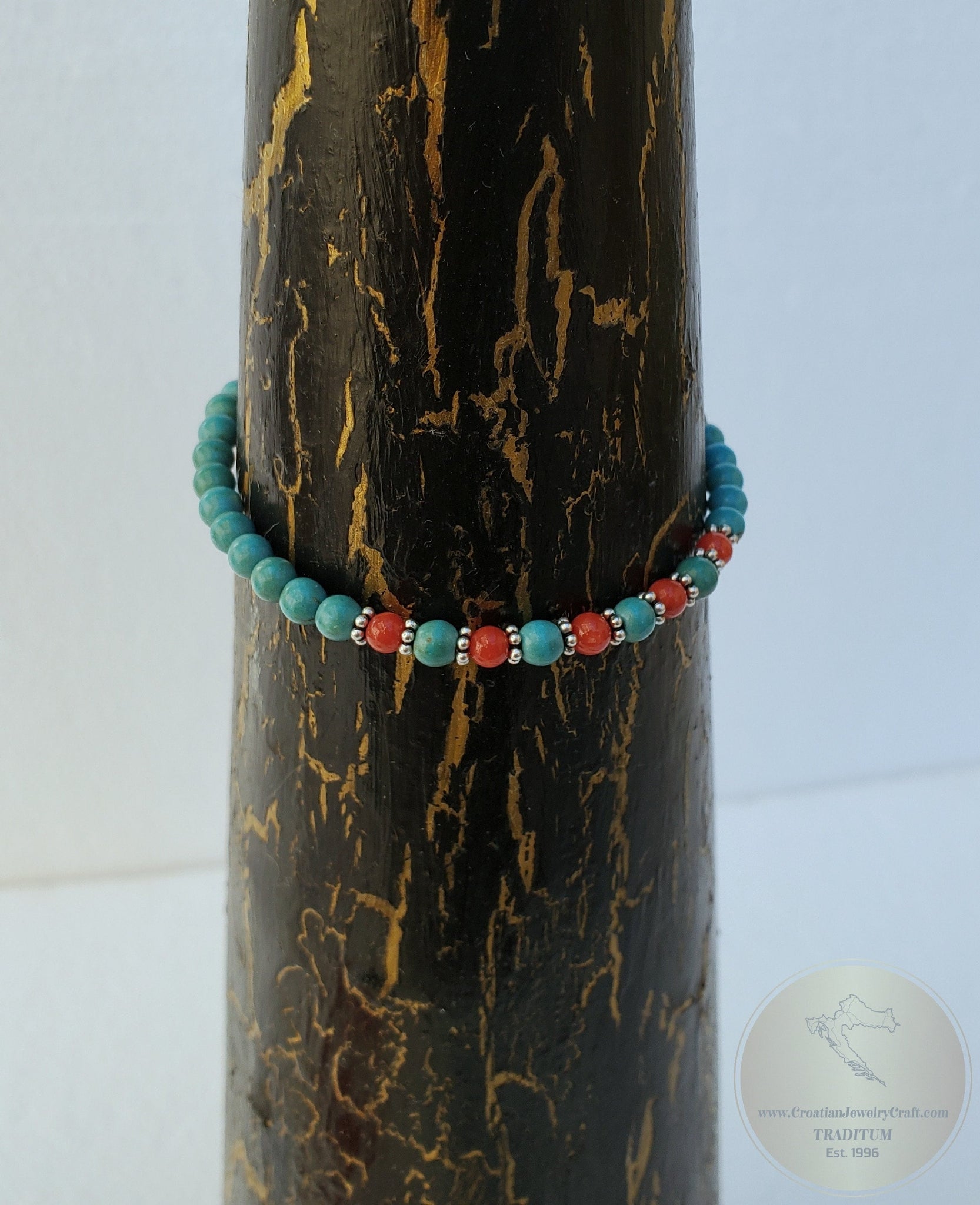 Small Round Bead Turquoise Bracelet, Red Mediterranean Coral Sterling Silver Bracelet, Natural Coral Jewelry