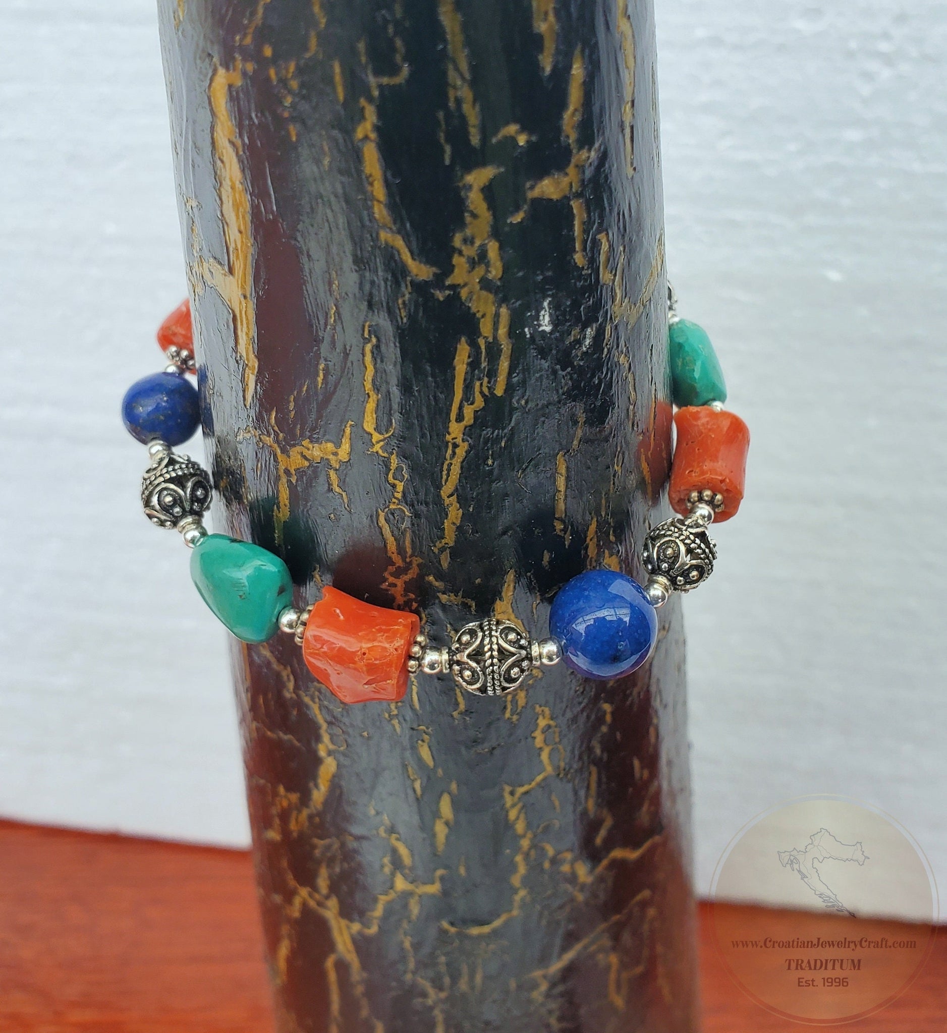 ★ Unique bracelet made from the semi-rustic beads of Mediterranean coral in combination with turquoise and lapis lazuli gemstone. Adorned with filigree ball elements - replicas of the 19th century traditional - heritage Croatian jewelry from Dubrovnik - Dalmatia region. Everything is handmade from solid sterling silver 925, while the surface of the ball elements is oxidized to match their vintage style.★