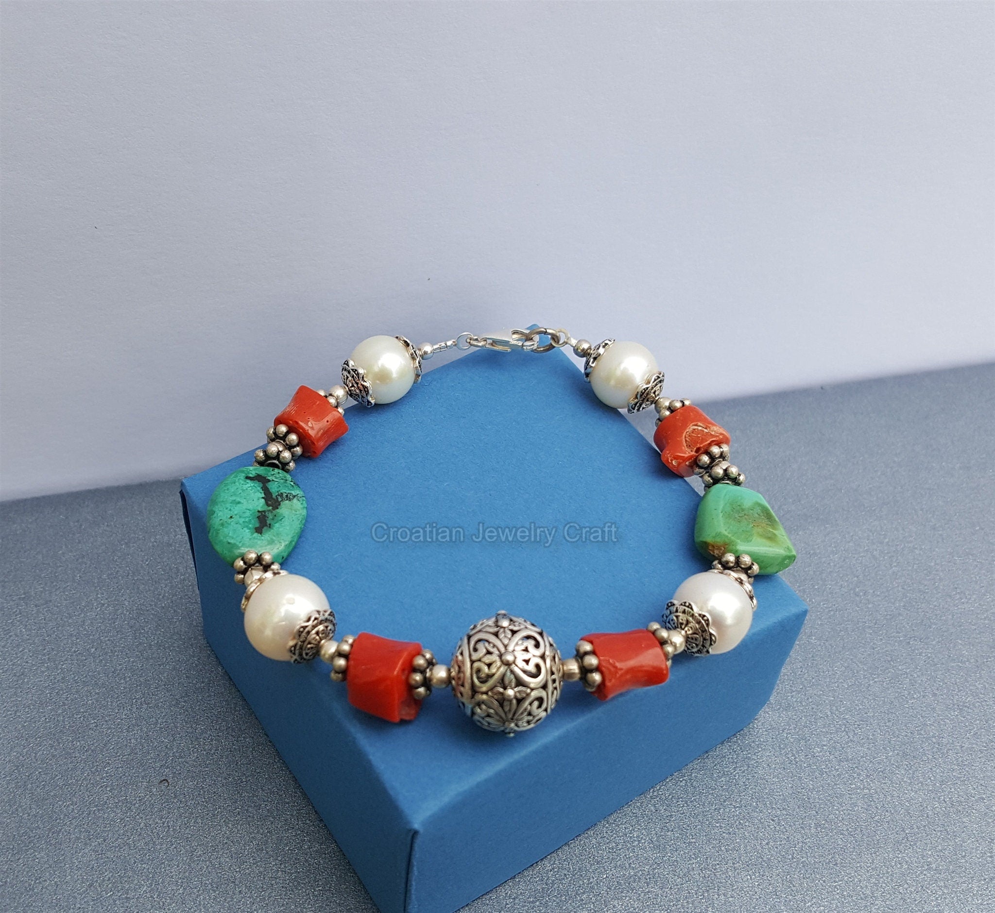 ★ Unique sterling silver bracelet made from the combination of natural turquoise gemstone, white freshwater pearl, and precious, semi-rustic beads of old, red Mediterranean coral. Adorned with various spacer elements, pearl caps and floral decorative ball element. Everything is handmade from solid sterling silver 925. ★