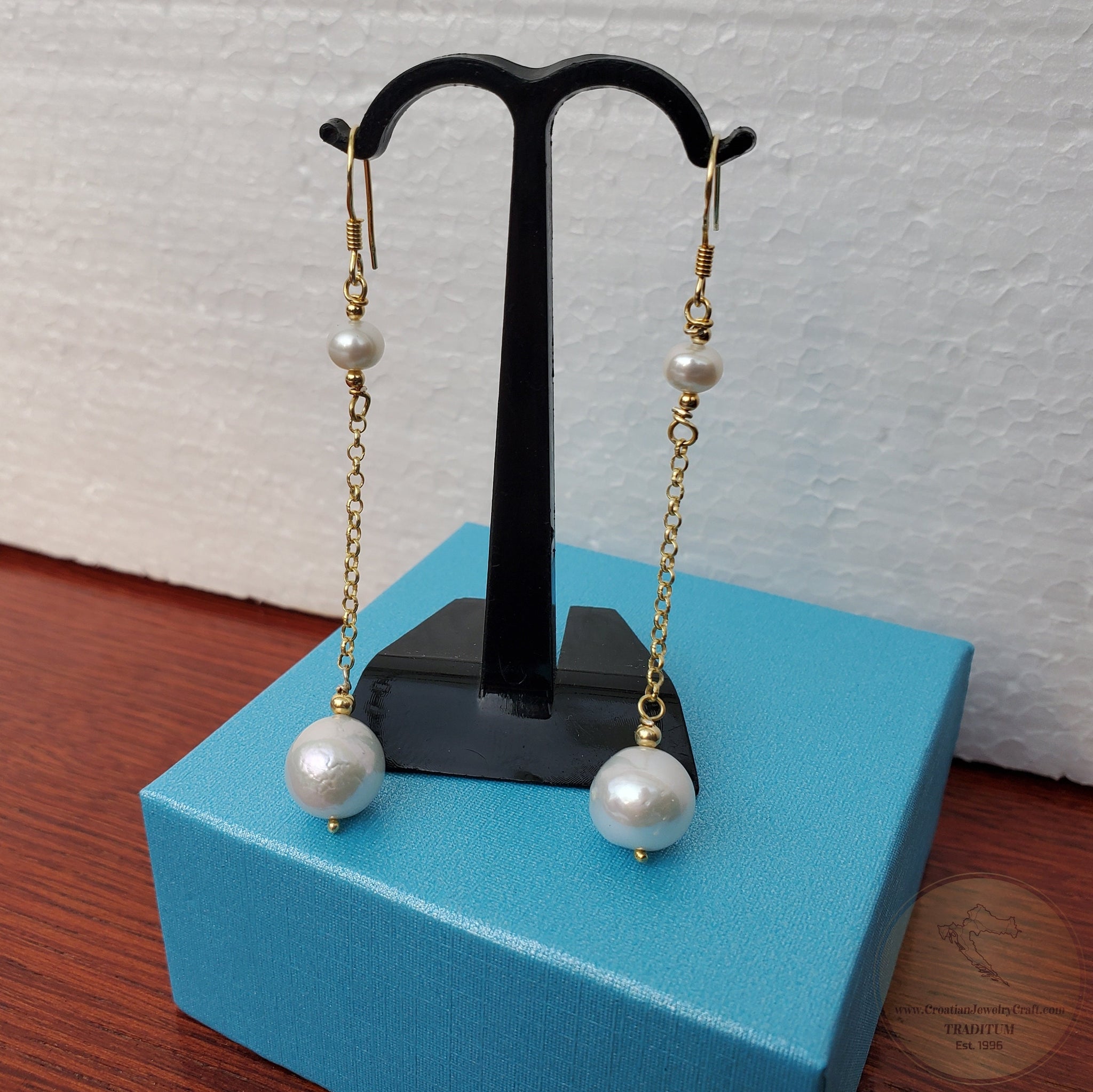 ★ Trace chain dangle pearl earrings, handmade in solid sterling silver which is plated with 24 k gold and natural, white freshwater pearl. ★