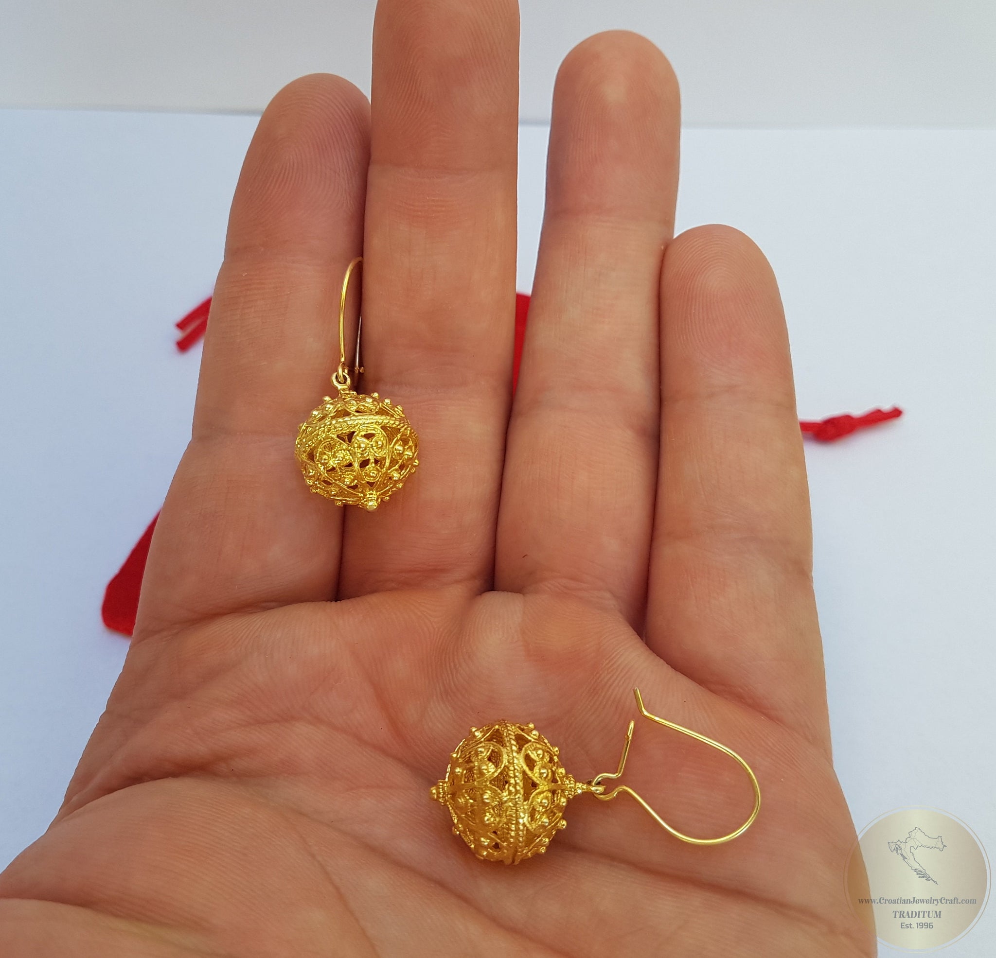 Traditional Croatian Earrings, Filigree Ball Earrings, 24k Gold Plated Dangle Earrings, Dubrovnik Jewelry, Gold Plated Sterling Silver