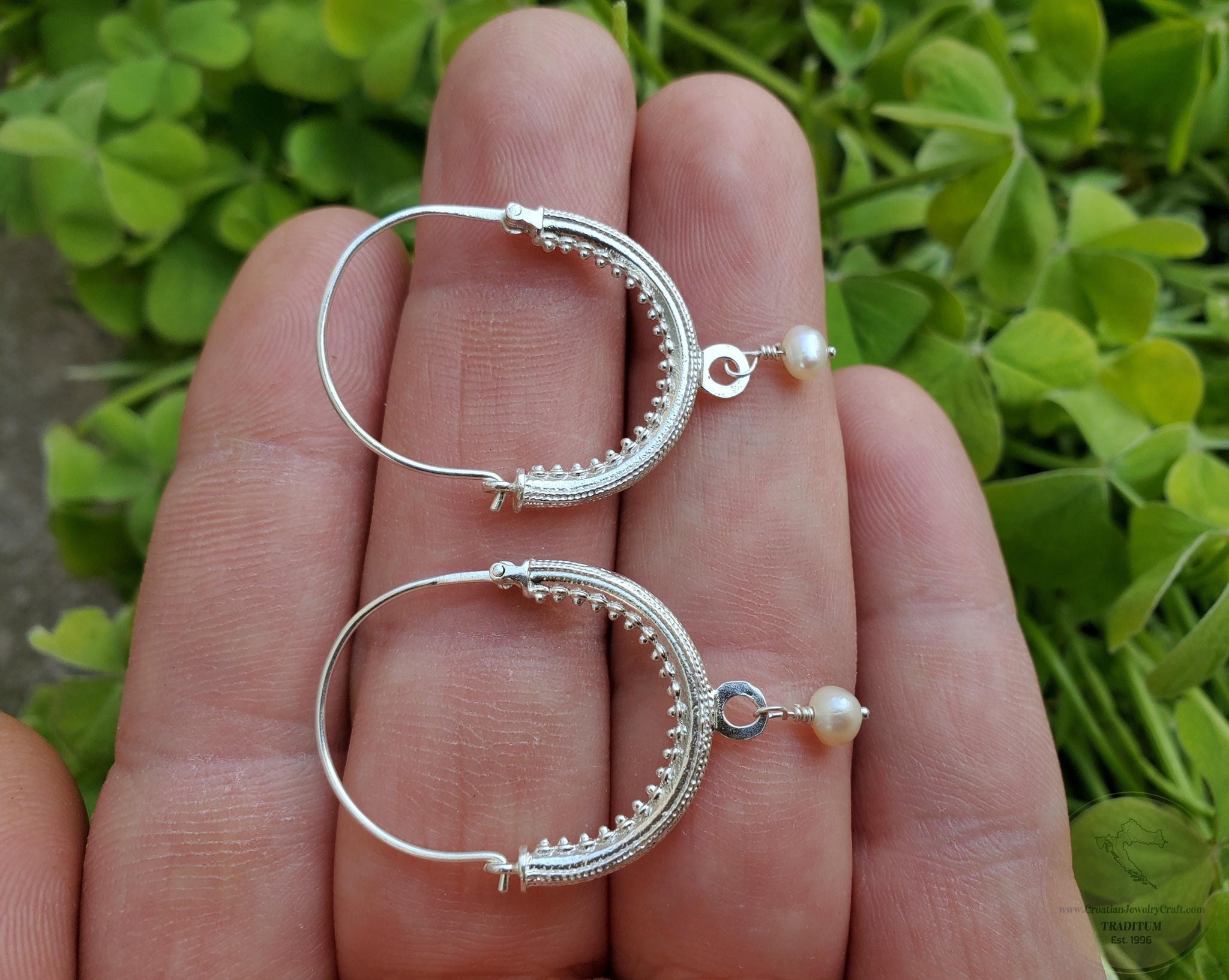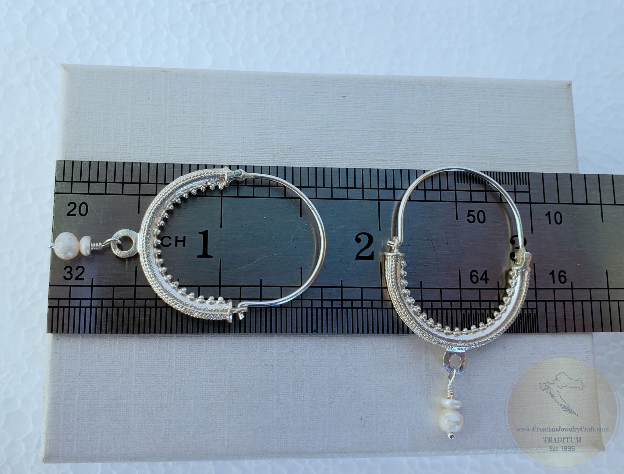 ★ Dubrovnik "Konavle" filigree hoop earrings, 2.35 cm ( 0.92" ) in width. Replicas of traditional Dubrovnik jewelry from the 19th century - Croatian ethnic, heritage jewelry from Konavle region. Adorned with baroque-shaped natural, white freshwater pearl. Handmade from solid sterling silver. ★