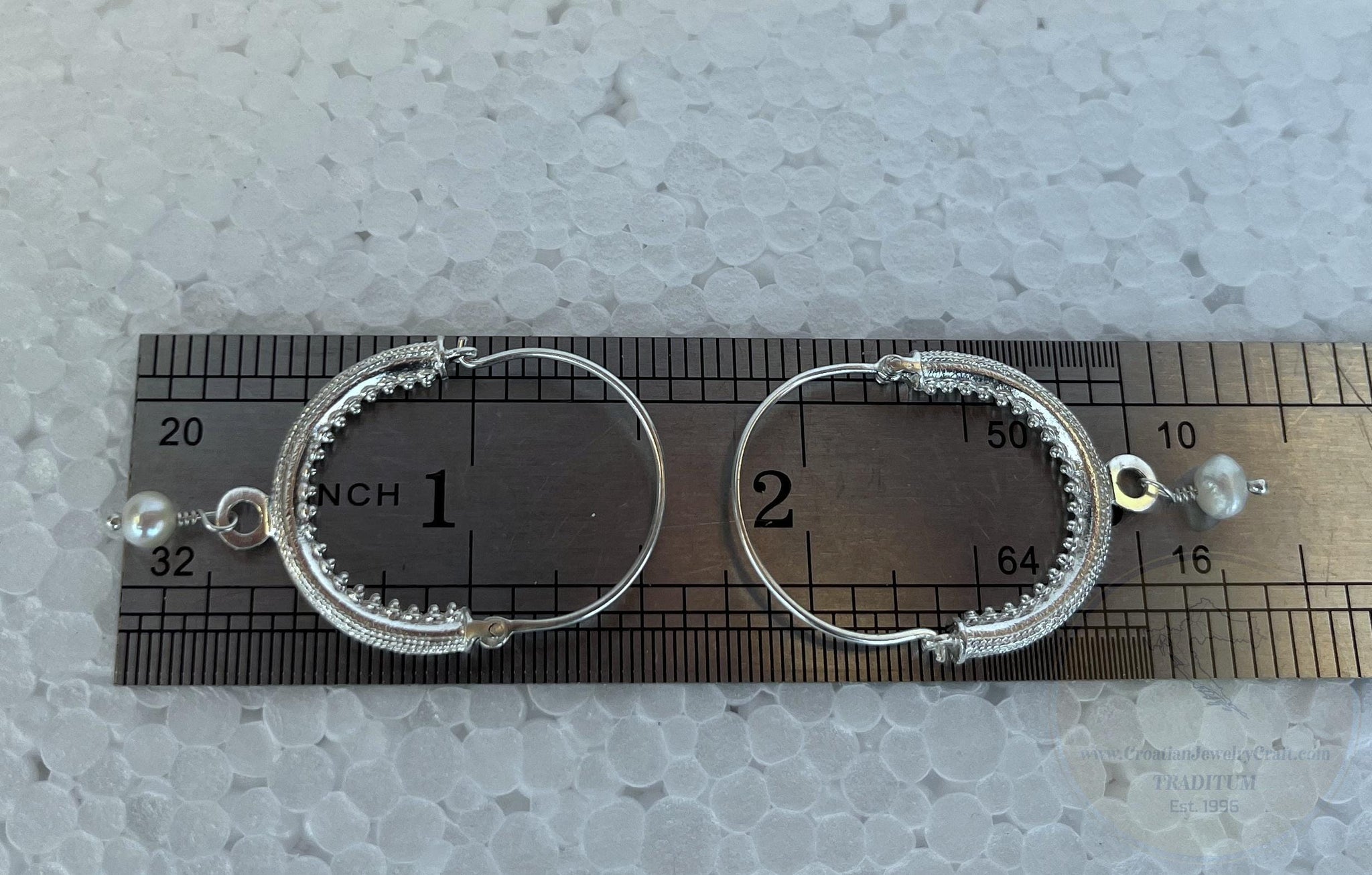 Croatian Hoop Earrings, Sterling Silver Filigree Hoops, White Pearl Dangle Hoops, Konavle Earrings, Dubrovnik Jewelry, Wedding Jewelry