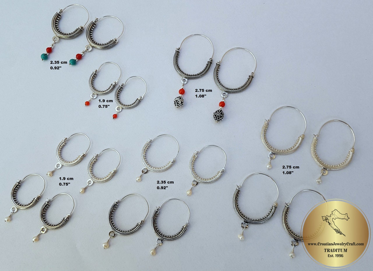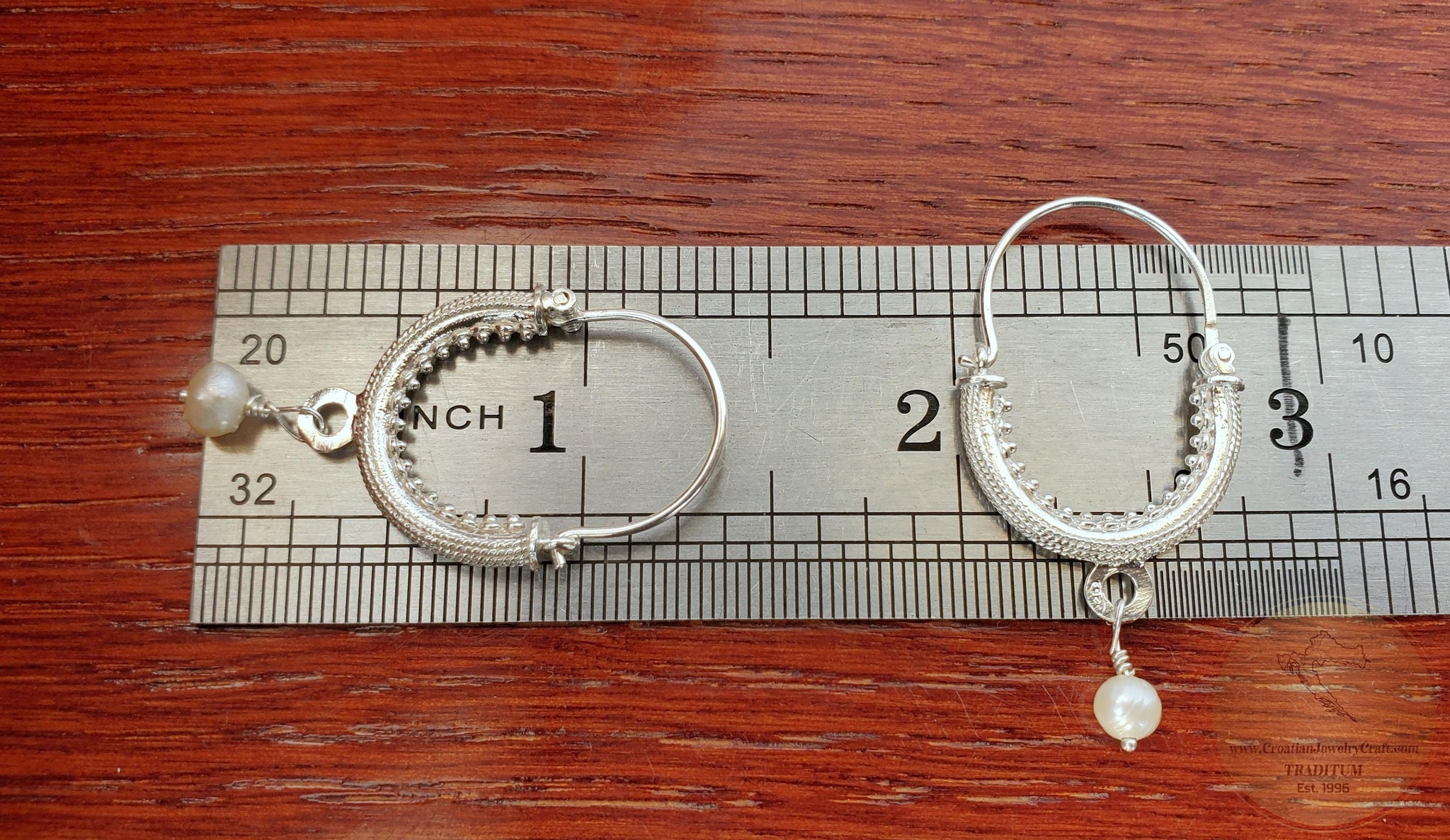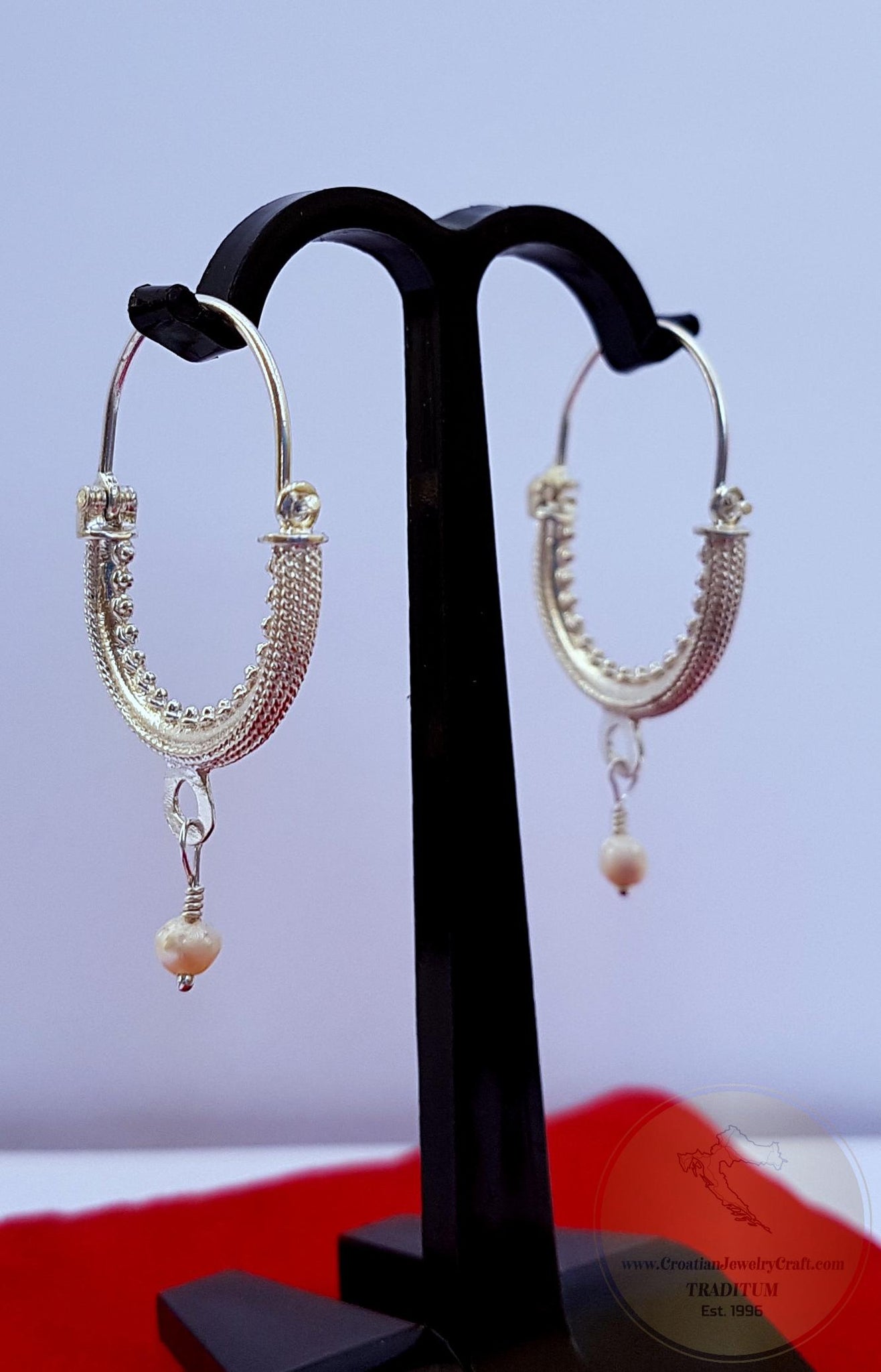 Croatian Hoop Earrings, Sterling Silver Filigree Hoops, White Pearl Dangle Hoops, Konavle Earrings, Dubrovnik Jewelry, Wedding Jewelry