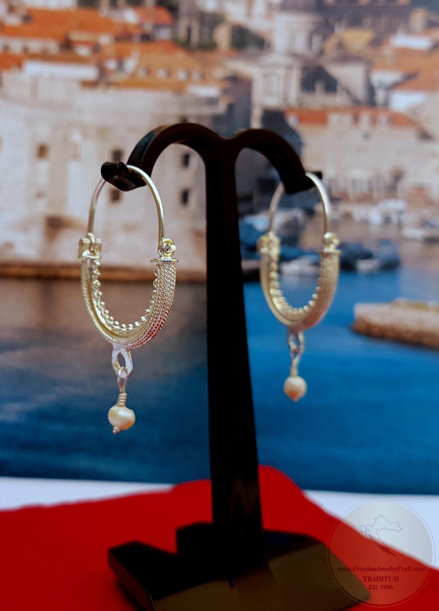 ★ Dubrovnik "Konavle" filigree hoop earrings. Replicas of traditional Dubrovnik jewelry from the 19th century - Croatian ethnic, heritage jewelry from Konavle region. Adorned with baroque-shaped natural, white freshwater pearl. Handmade from solid sterling silver. ★