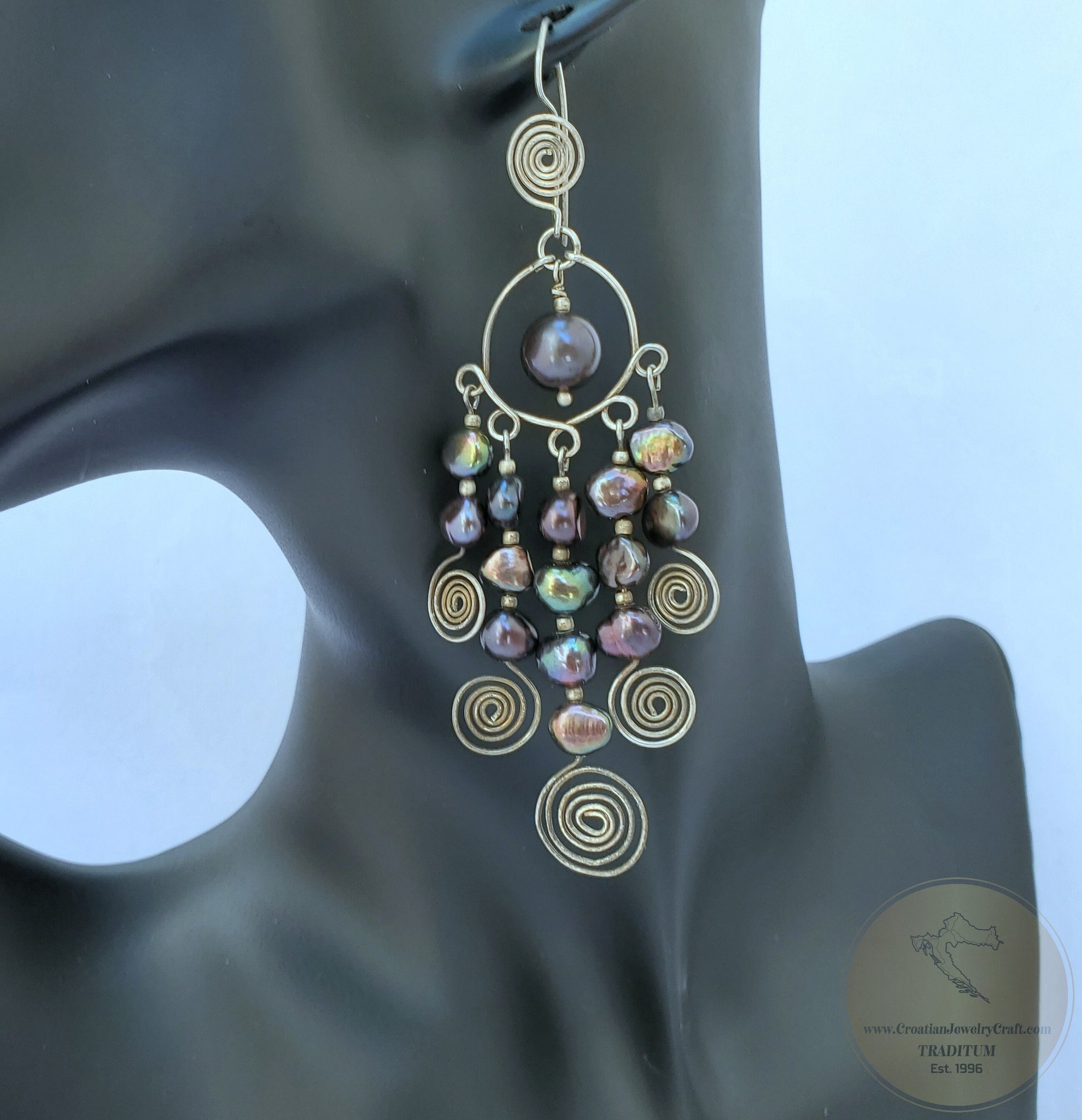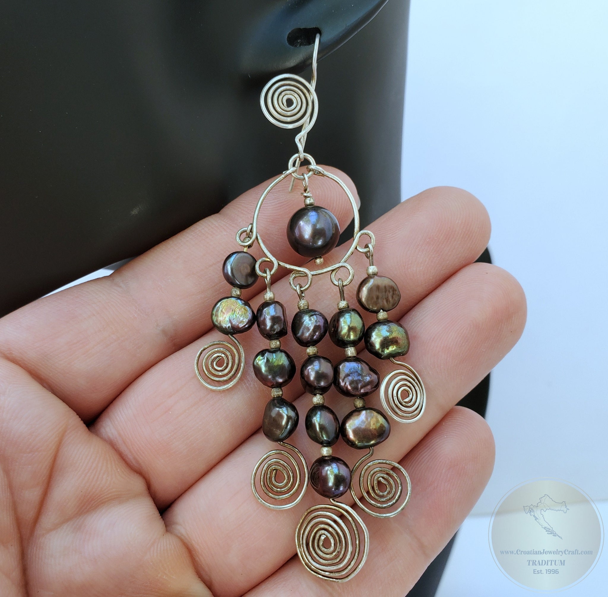 Long Pearl Earrings, Large Black Pearl Earrings, Unique Handmade Chandelier Pearl Earrings, Statement Pearl Earrings, Solid Sterling Silver