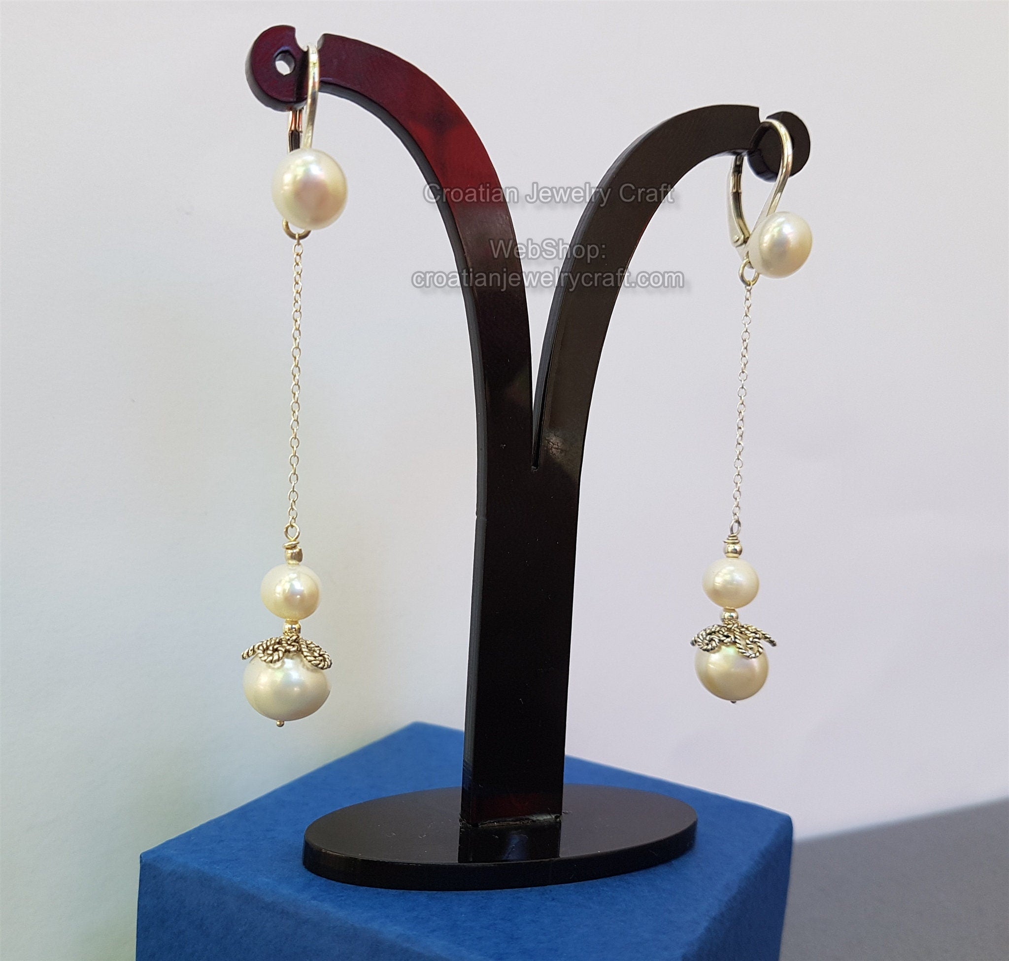 ★ Earrings handcrafted in solid sterling silver from natural freshwater pearl. Based on a decorative lever-back ear-wires, with filigree-cap adorned pearl bead suspended on a dainty fine-trace chain. ★