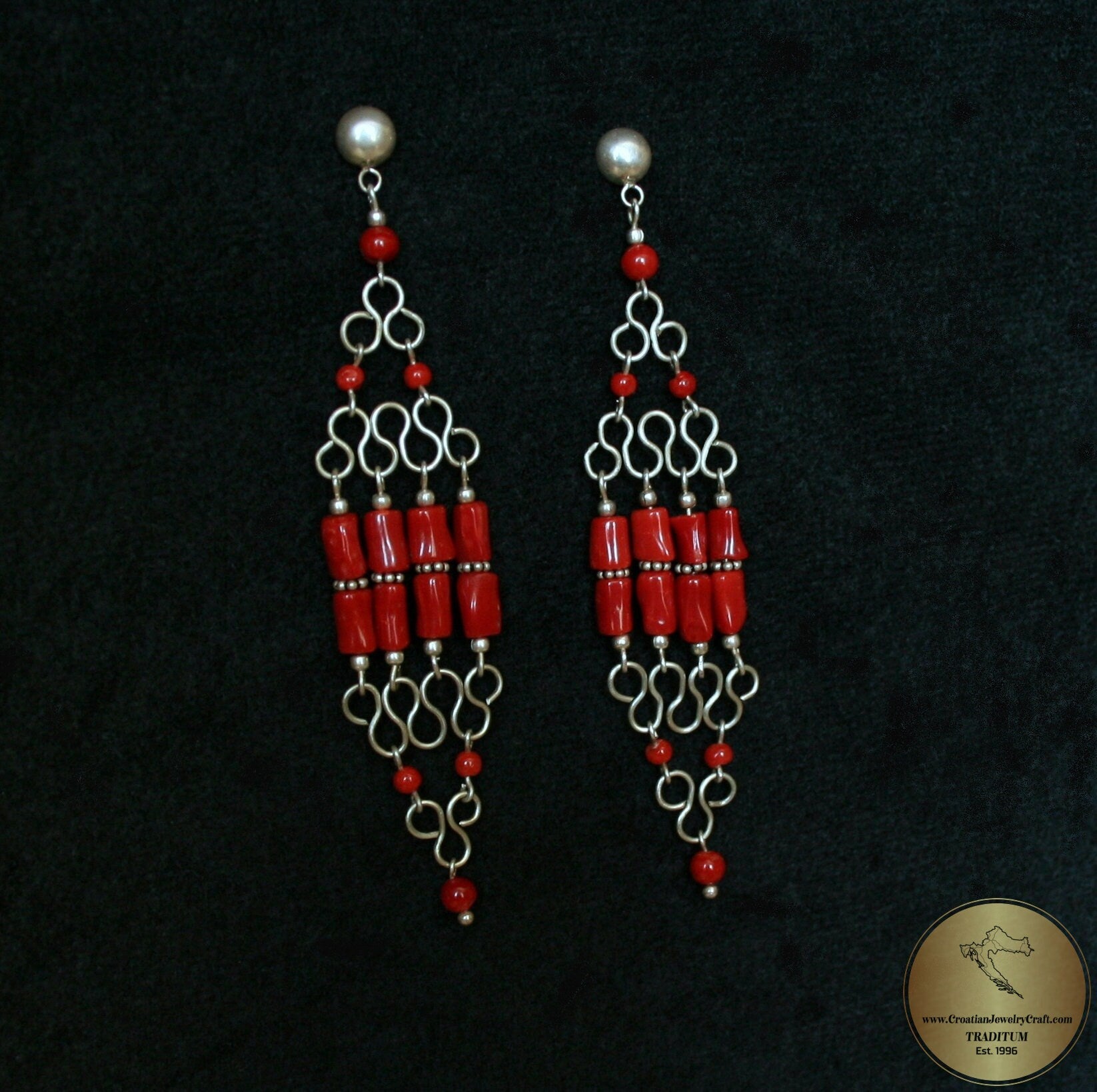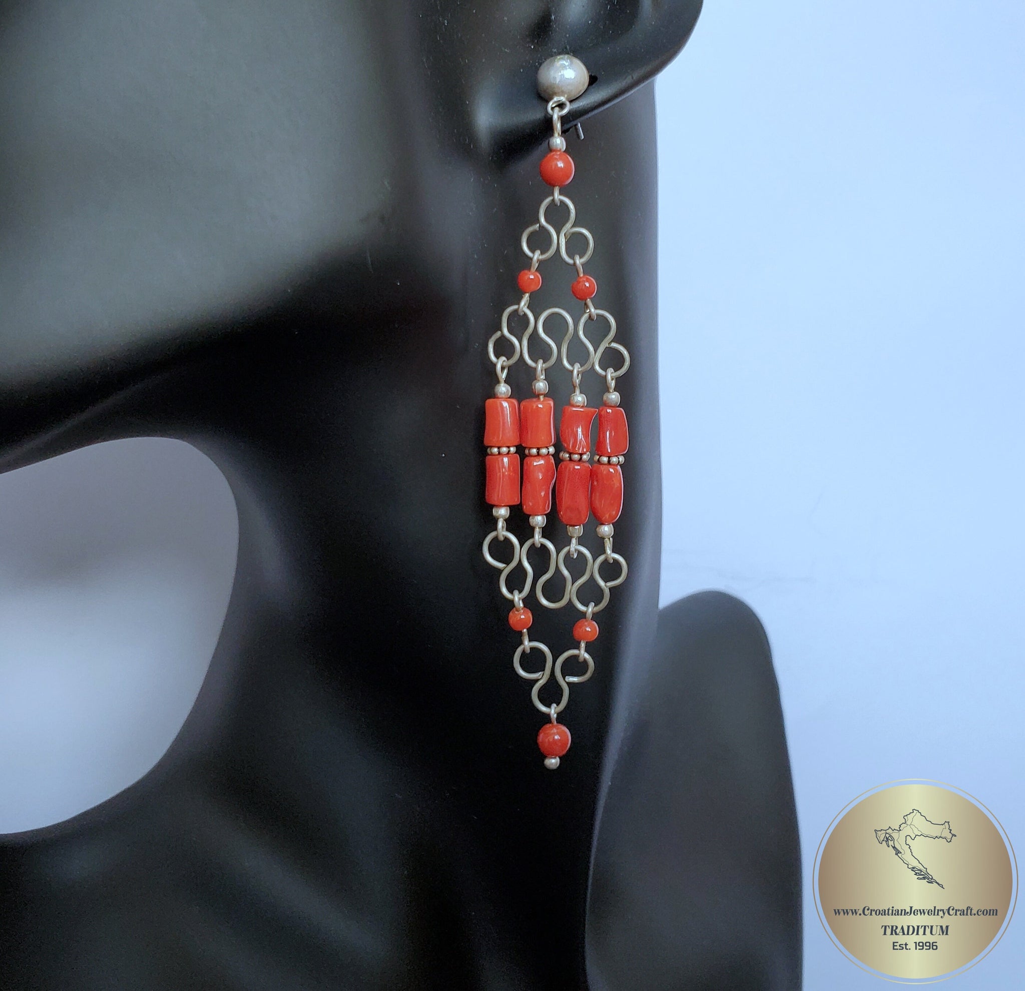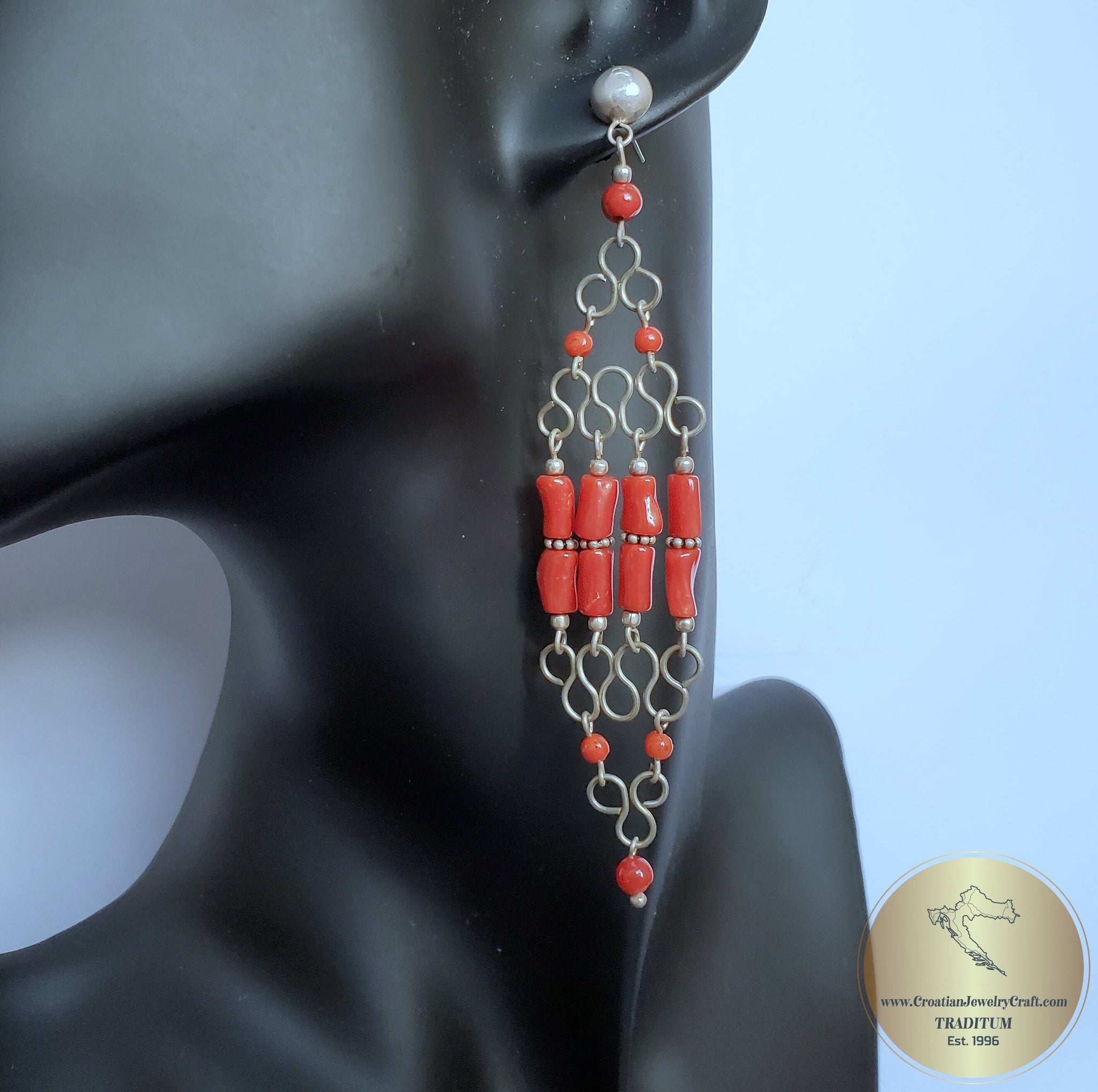 ★ One of a kind long chandelier earrings. Made with precious Mediterranean coral, based on a handcrafted wirework frame. Adorned with small spacer beads between corals, everything is handmade and of solid sterling silver 925. ★