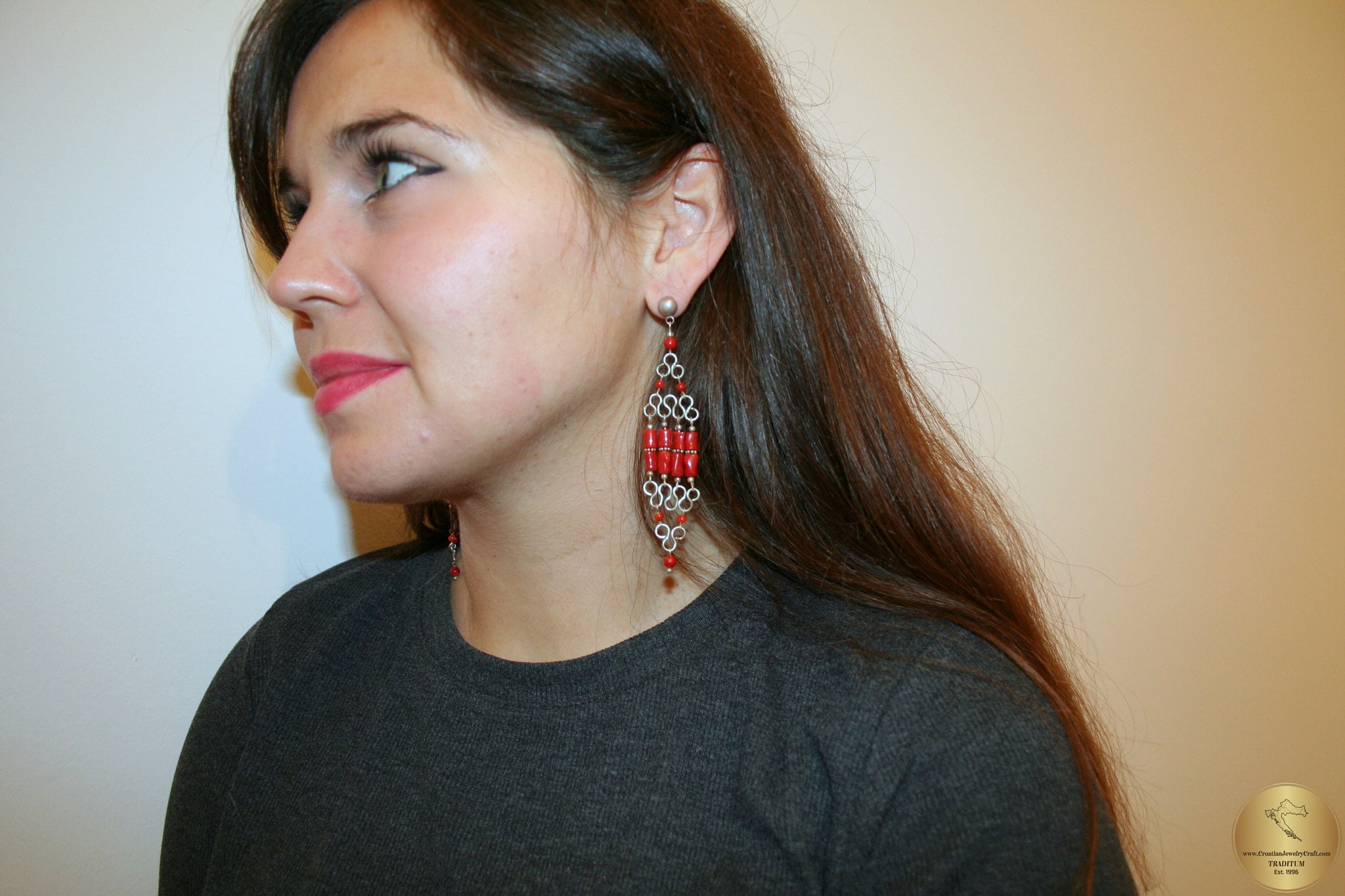 Red Coral Chandelier Earrings, Long Earrings, Undyed Mediterranean Coral Statement Earrings, Unique Artisan Earrings, Silver Bridal Earrings