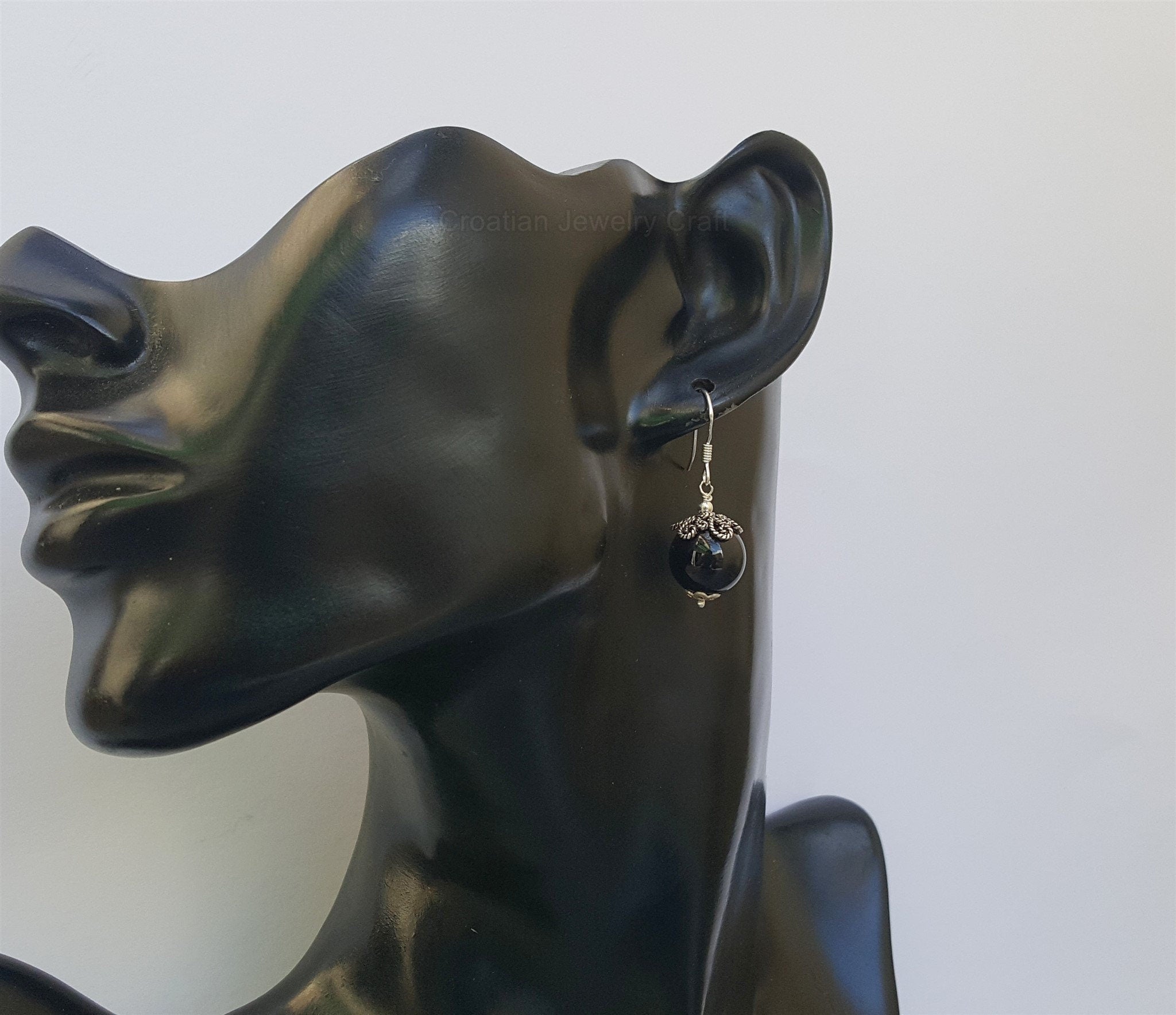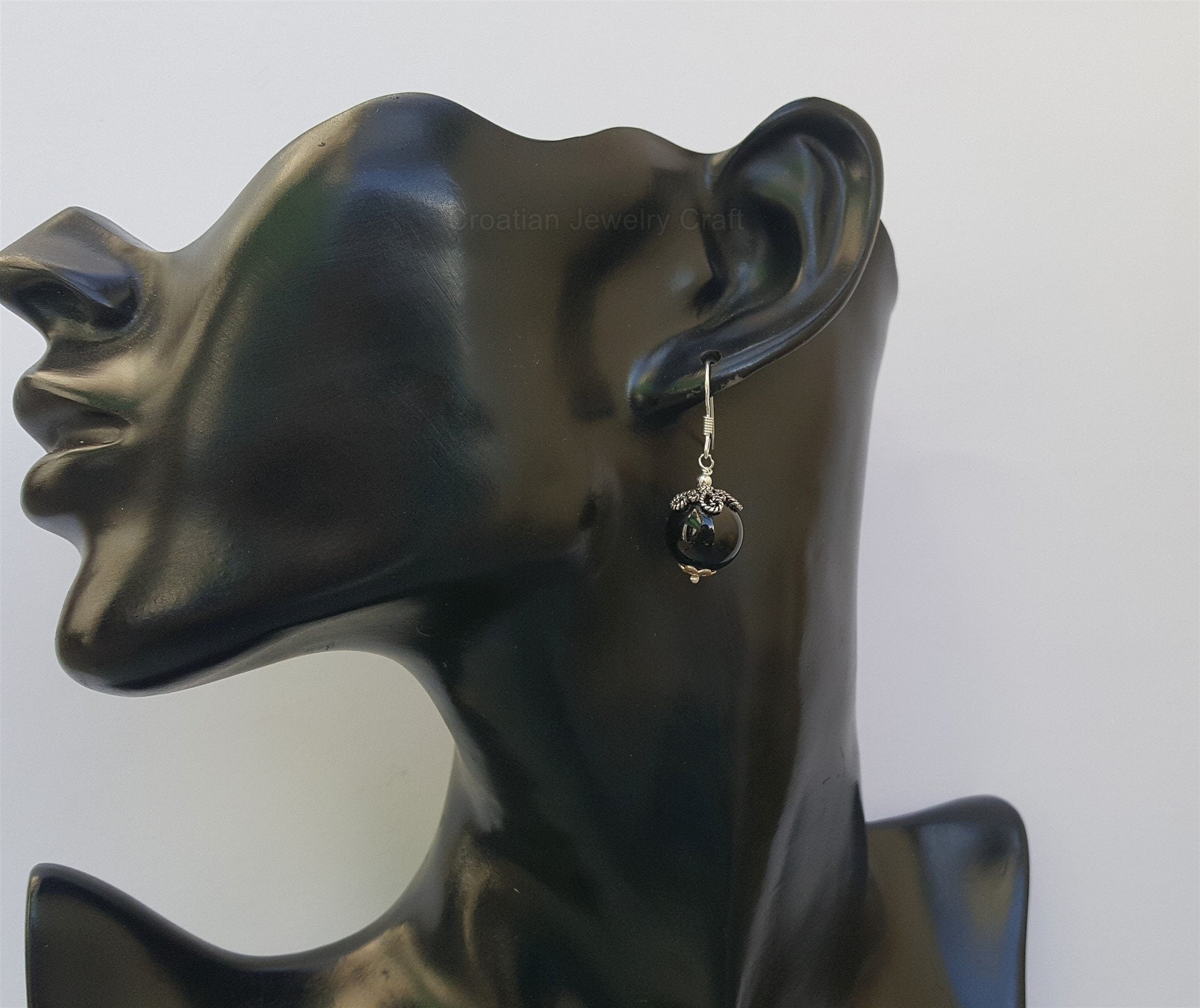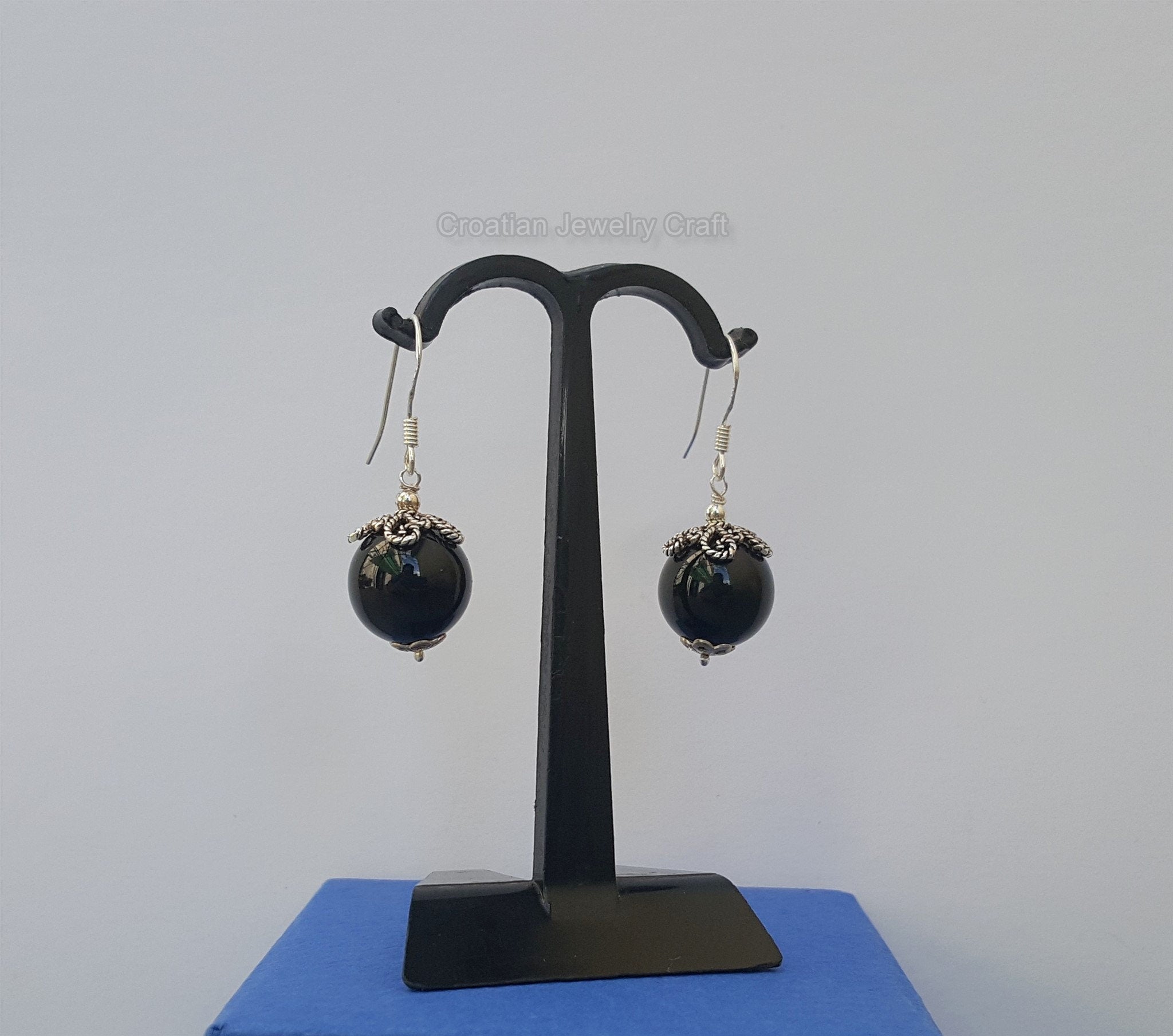 Round Ball Drop Earrings, Black Onyx Earrings, Black Bead Drop Dangle Earrings, Filigree Earrings For Women, Black Earrings