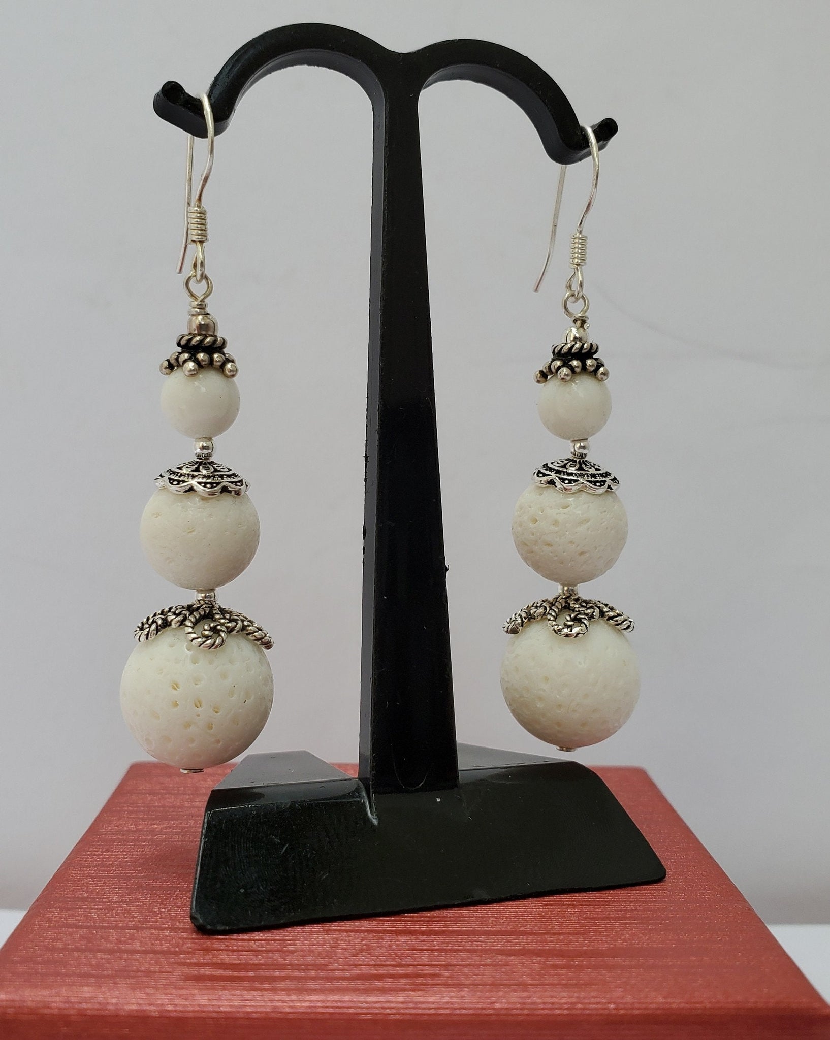 Sterling Silver Triple Beaded Earrings, White Coral Earrings, White Dangle Earrings, Simple White Stone Earrings, Natural Coral Jewelry