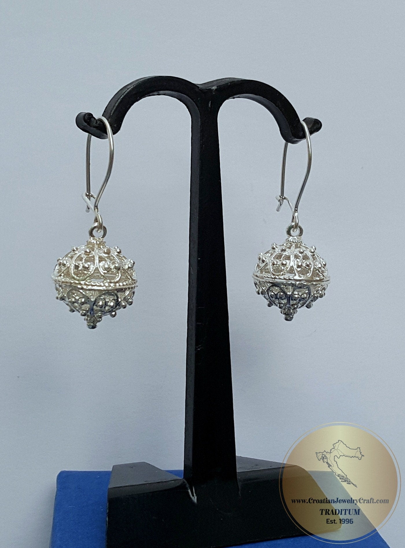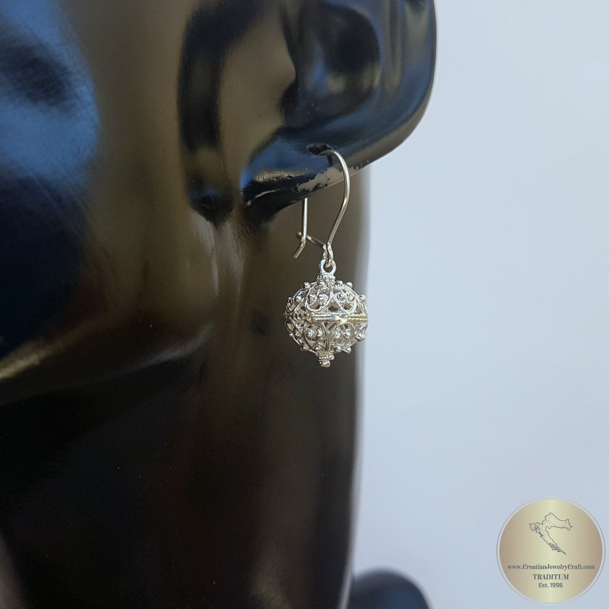 Traditional Croatian Hook Earrings, Sterling Silver Earrings, Filigree Ball Earrings, Dubrovnik Earrings, Handmade Metalwork Earrings