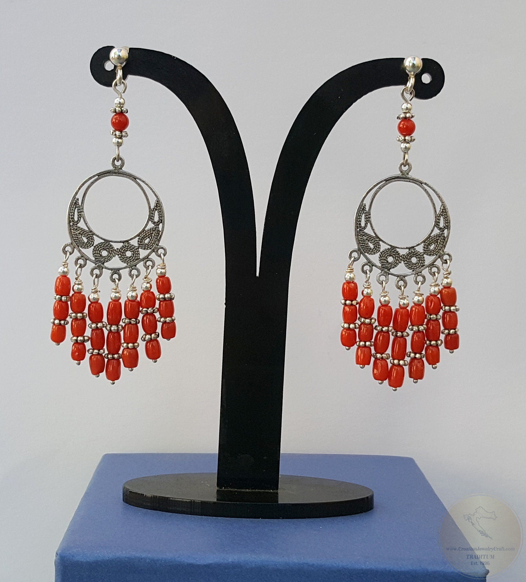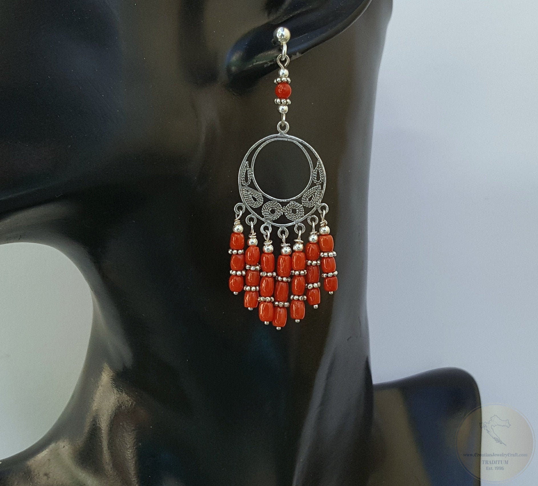 ★ Meticulously handcrafted earrings made from precious Mediterranean coral. The coral is unique, all natural and hasn't been treated or dyed in any way. Earrings are based on a silver wire, around filigree centerpiece. Design of the filigree pattern, is inspired by traditional, Croatian filigree jewelry. Everything is handmade from solid sterling silver 925. ★