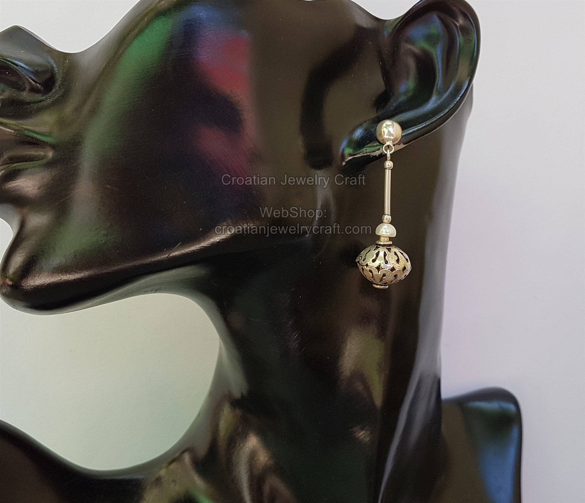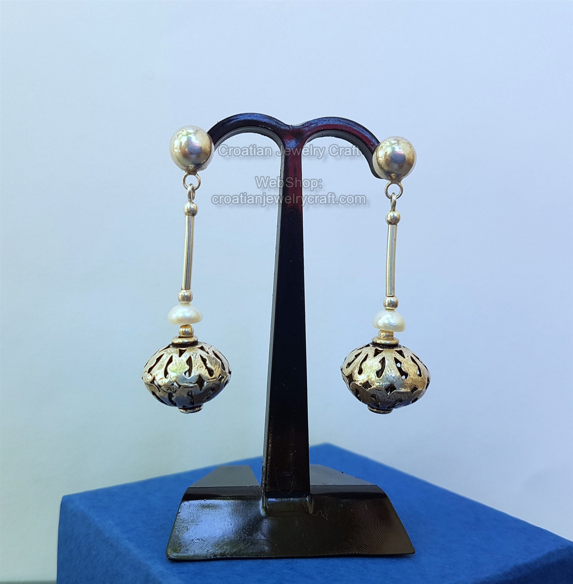 Earrings handcrafted in solid sterling silver with natural, white freshwater pearls. Adorned with decorative ball elements, and based on a silver wire.