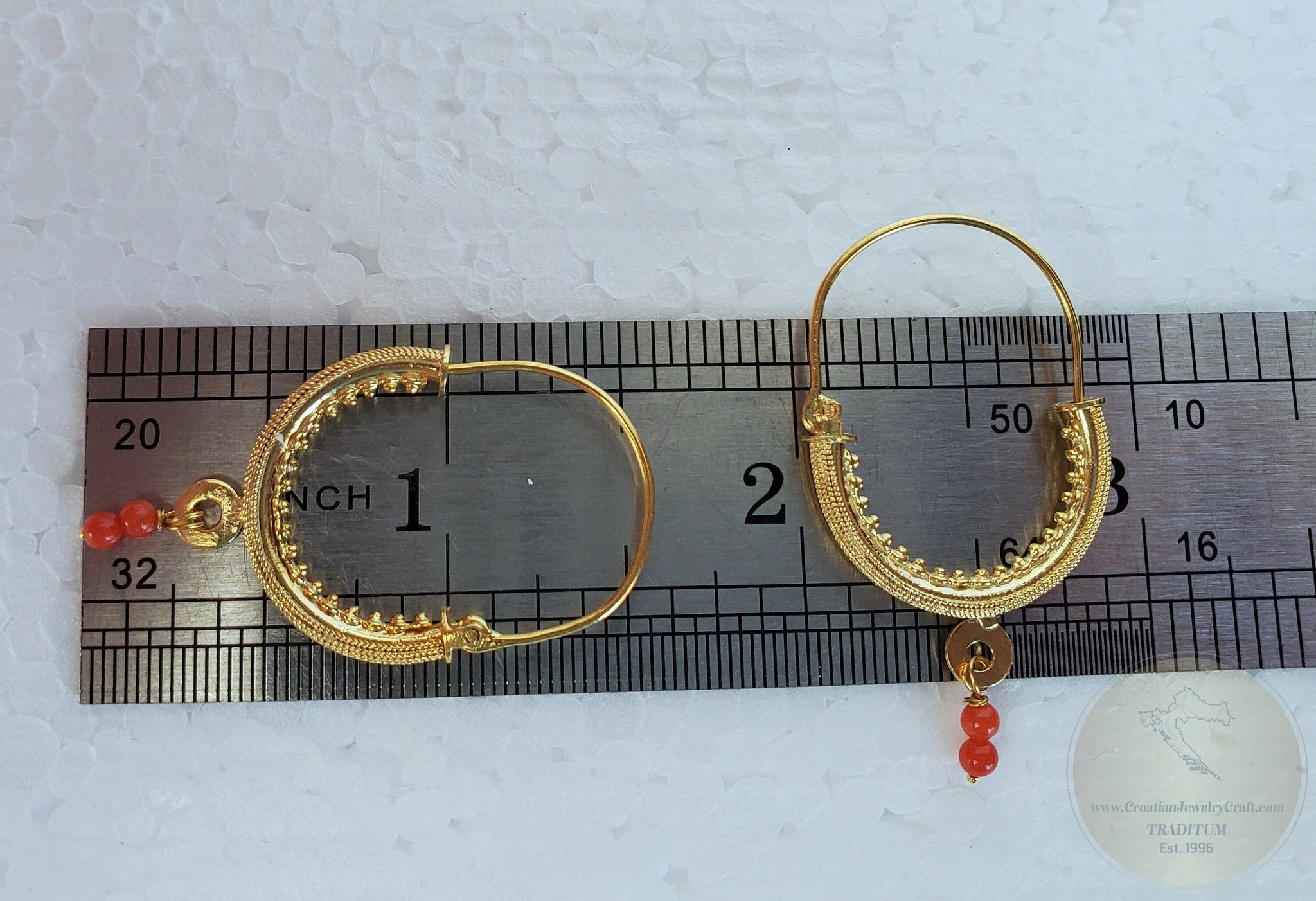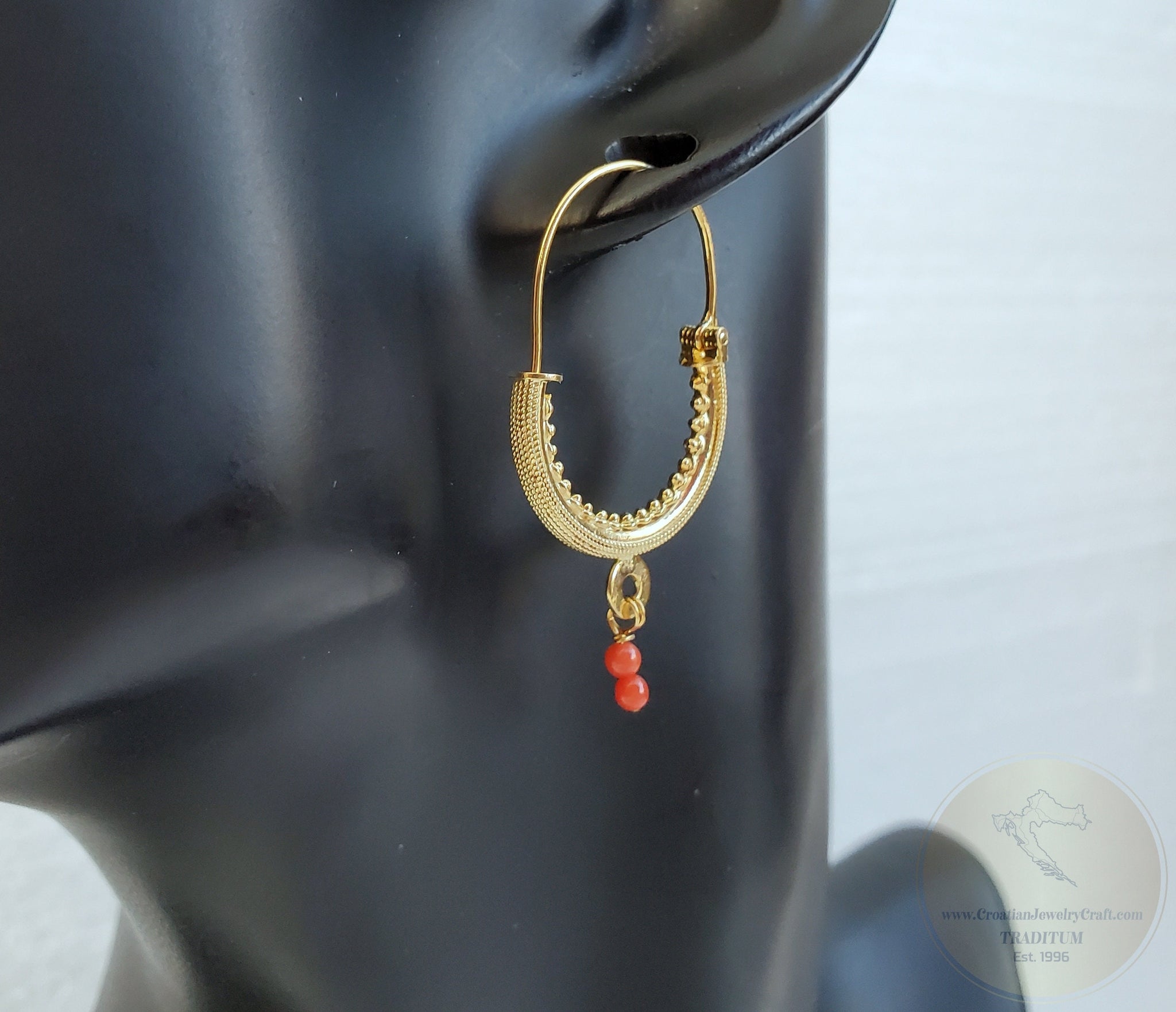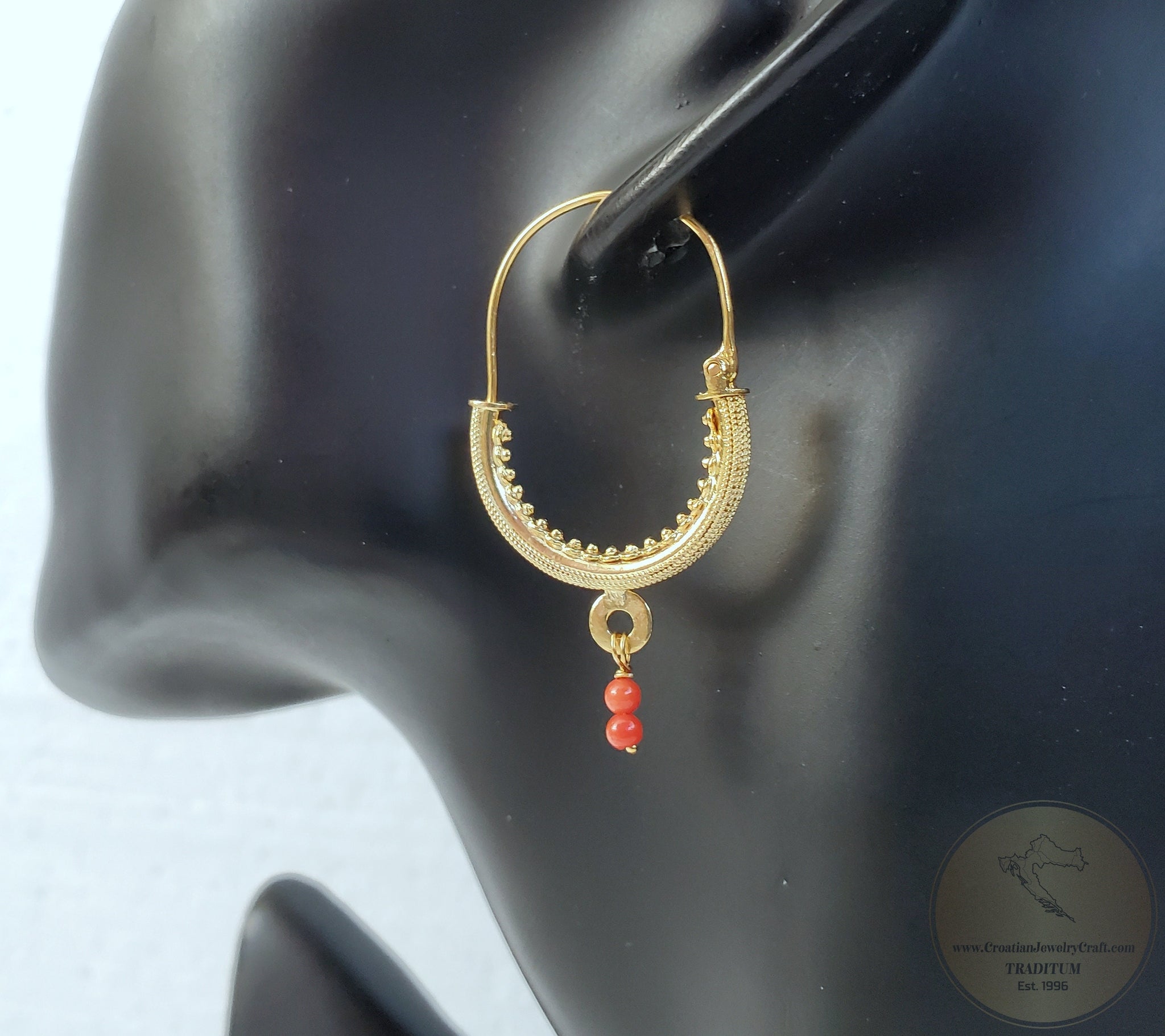 ★ Dubrovnik "Konavle" filigree hoop earrings in solid 14k gold. As worn by Queen Rania. True handcrafted replica of traditional Dubrovnik jewelry from the 19th century. Croatian ethnic, heritage jewelry from Konavle region. Adorned with precious, red Mediterranean coral, which is all natural and hasn't been treated or dyed in any way. ★