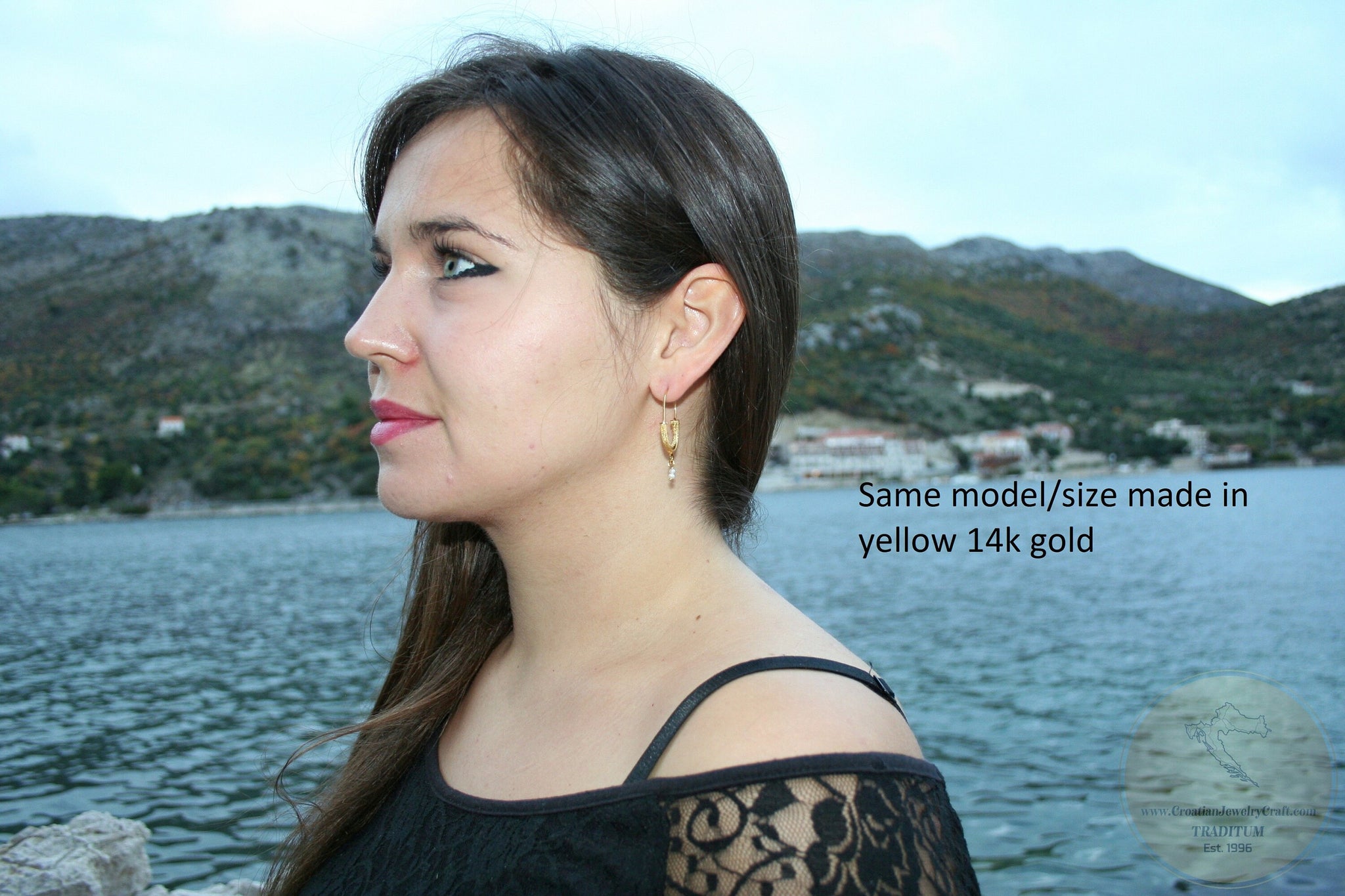 ★ On two photos of earrings on a girl is exactly the same model/size - made in yellow 14k gold. They are available in the shop here.