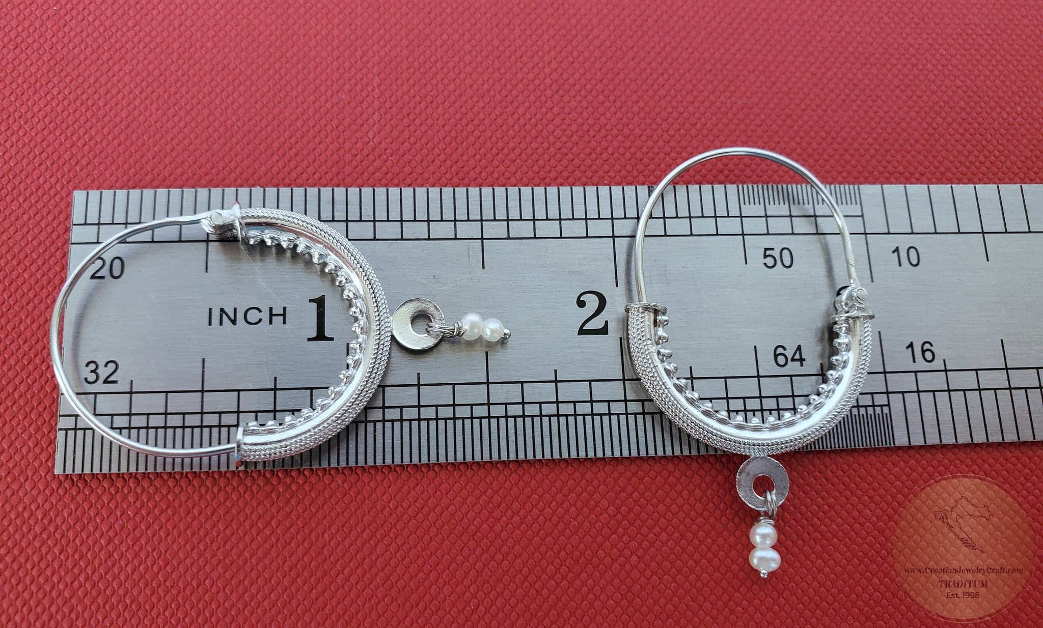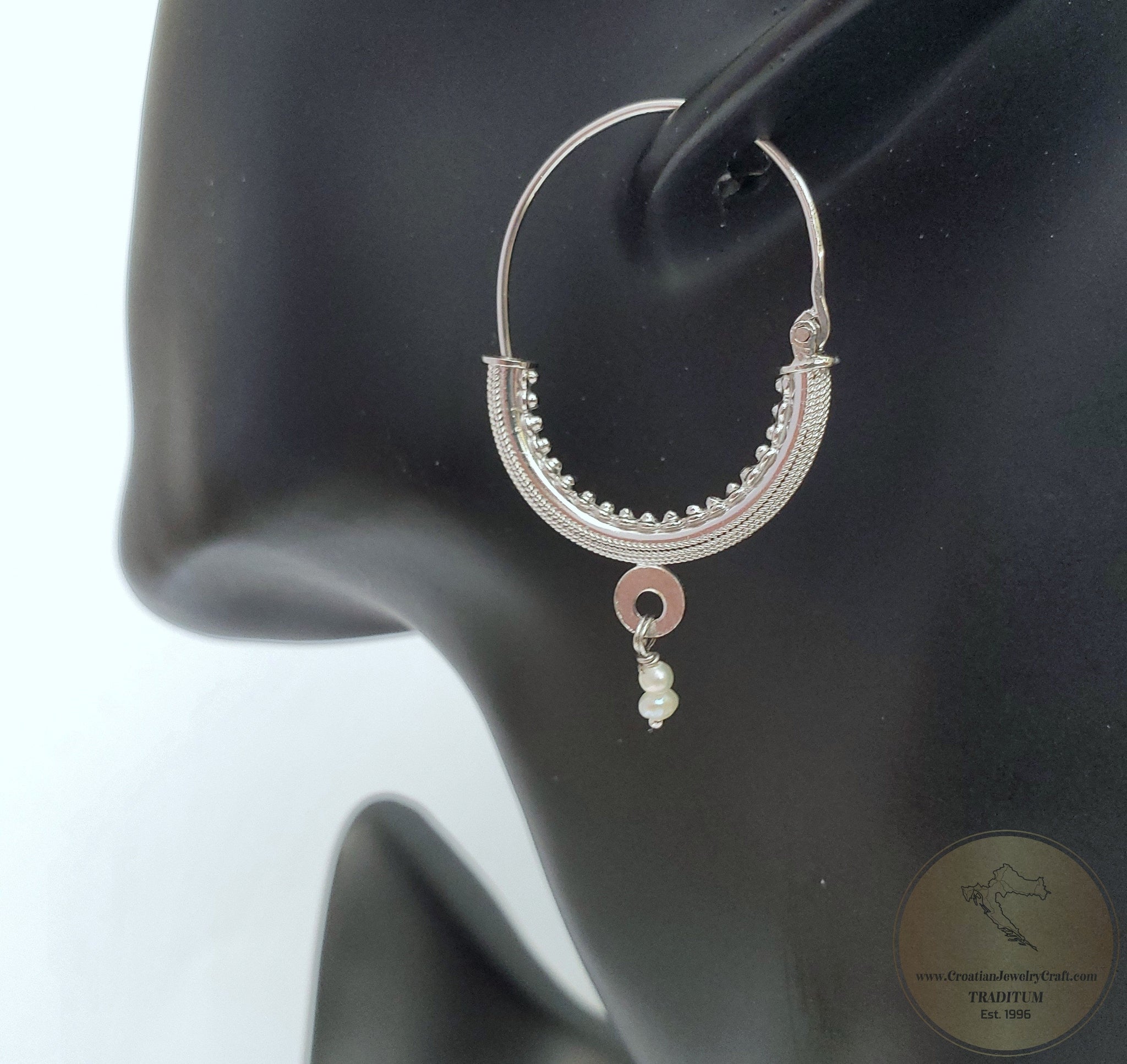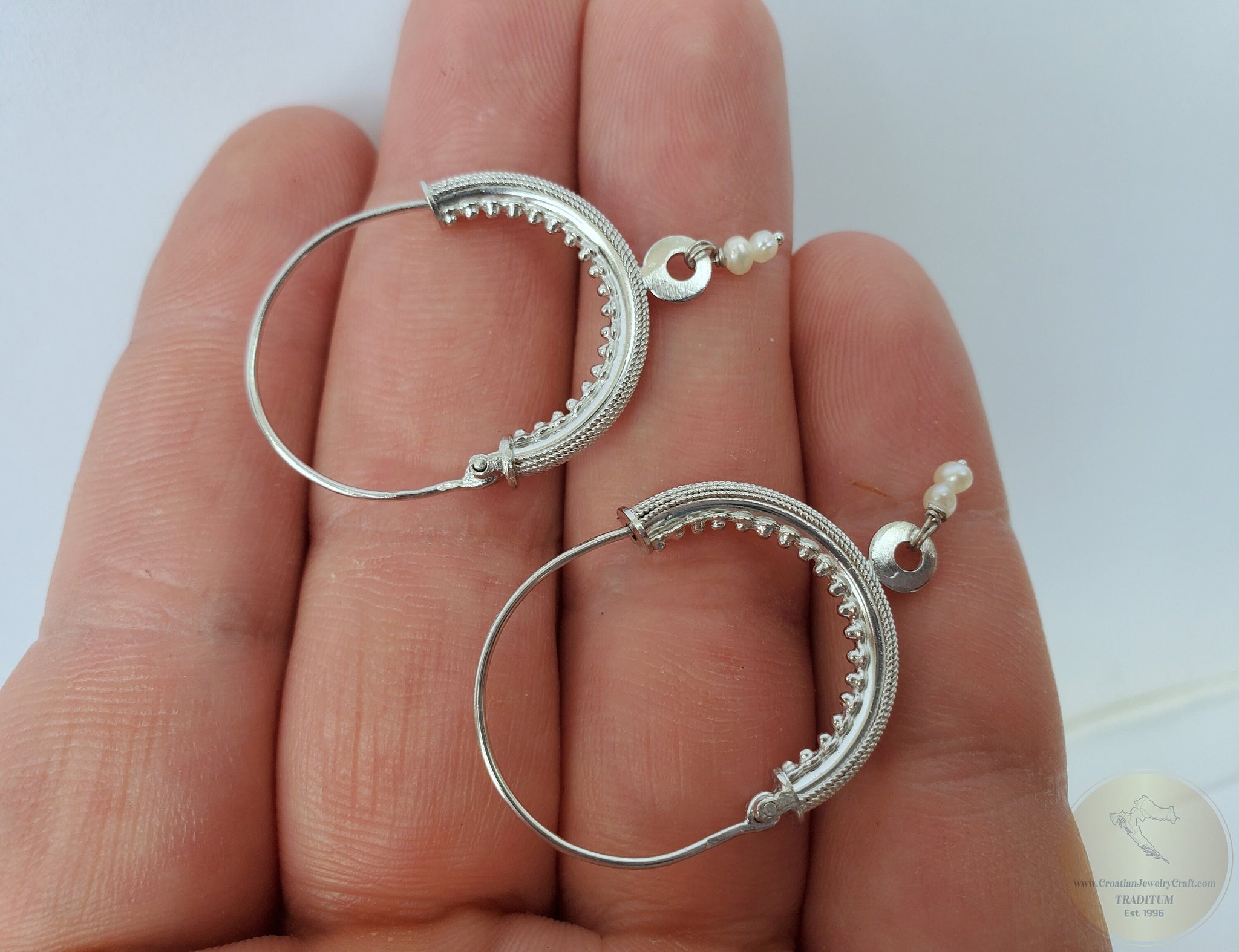 ★ Dubrovnik "Konavle" filigree hoop earrings. As worn by Queen Rania and Croatian president. True handcrafted replica of traditional Dubrovnik jewelry from the 19th century. Croatian ethnic, heritage jewelry from Dubrovnik Konavle region. Adorned with natural, white freshwater pearls. Meticulously handcrafted solid 14k white gold filigree metalwork. ★
