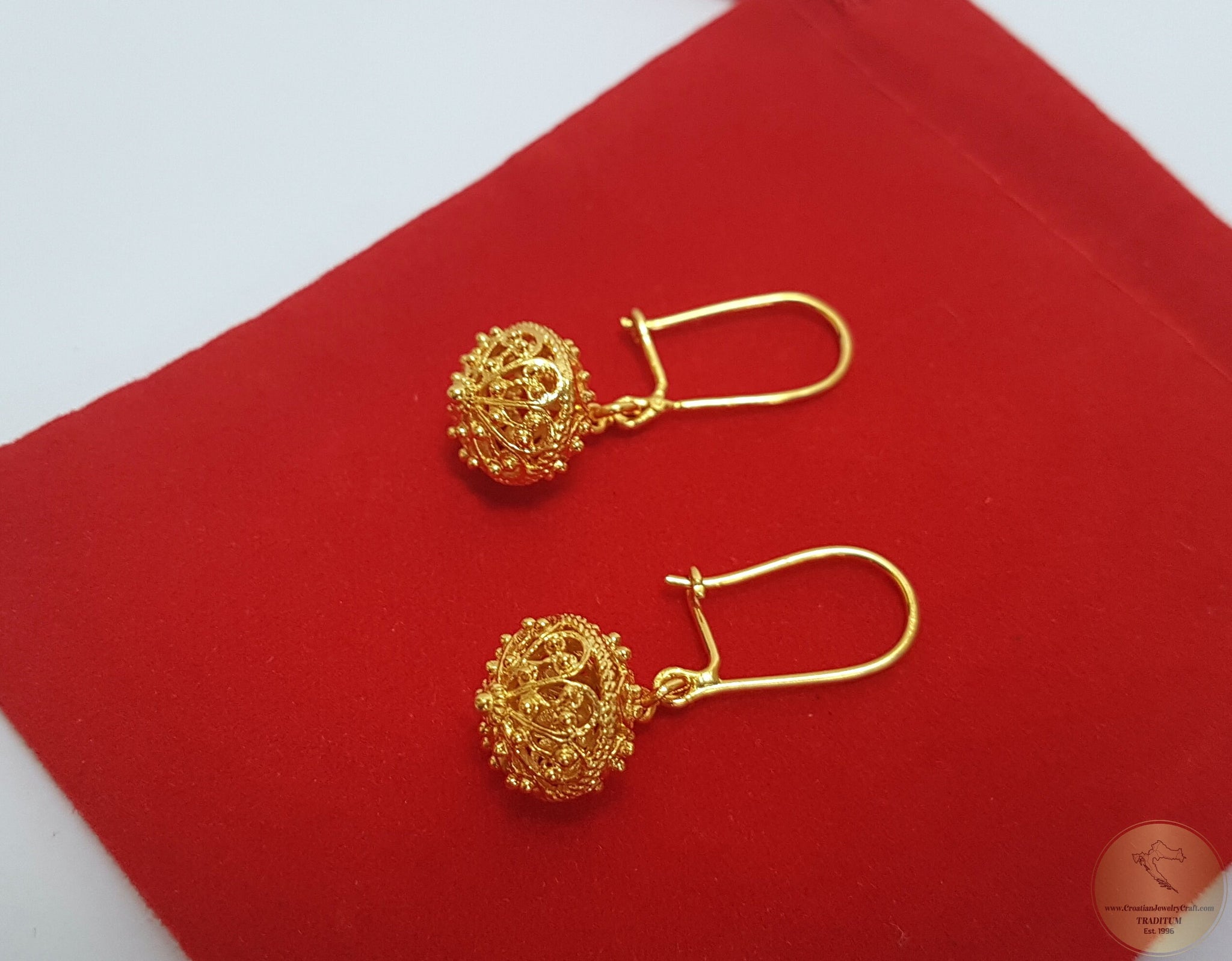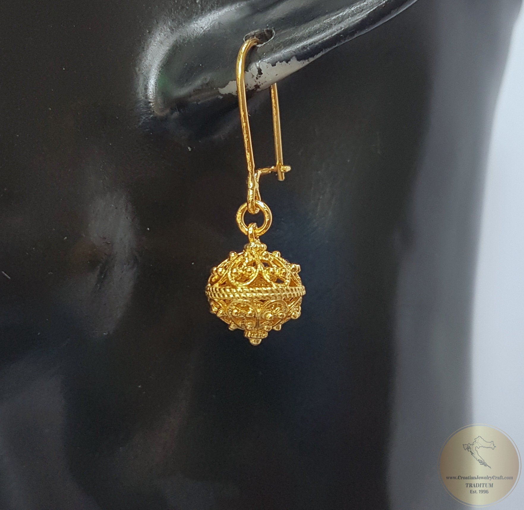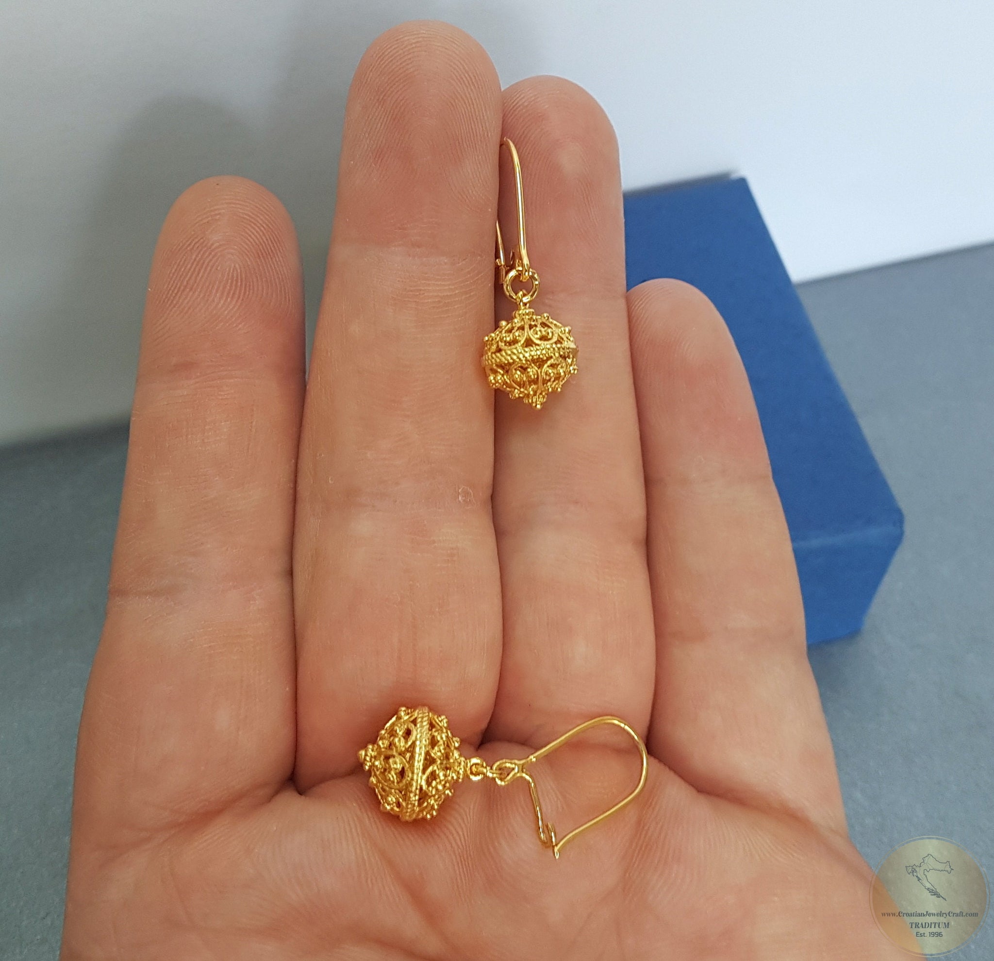 Handmade Croatian 14k Gold Filigree Earrings, Dubrovnik Gold Ball Earrings, Unique Traditional Ethnic Wedding Jewelry, Dangle Gold Earrings