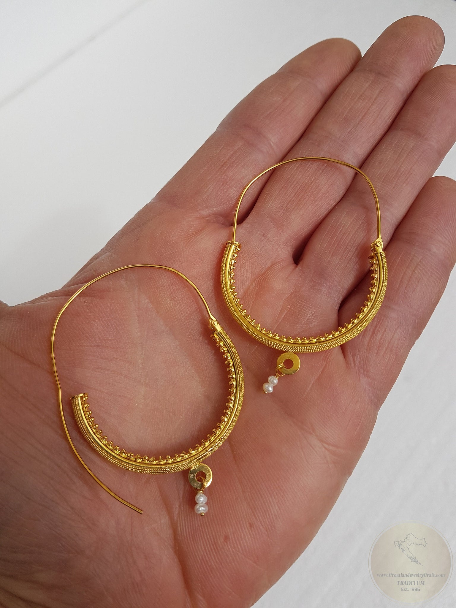 ★ Dubrovnik "Konavle" filigree hoop earrings. As worn by Queen Rania and Croatian president. True handcrafted replica of traditional Dubrovnik jewelry from the 19th century. Croatian ethnic, heritage jewelry from Dubrovnik Konavle region. Adorned with natural, white freshwater pearl. Meticulously handcrafted solid 14k gold filigree metalwork. ★