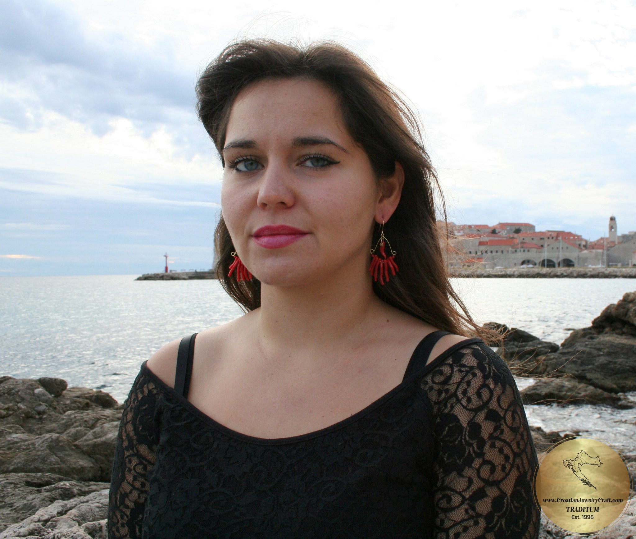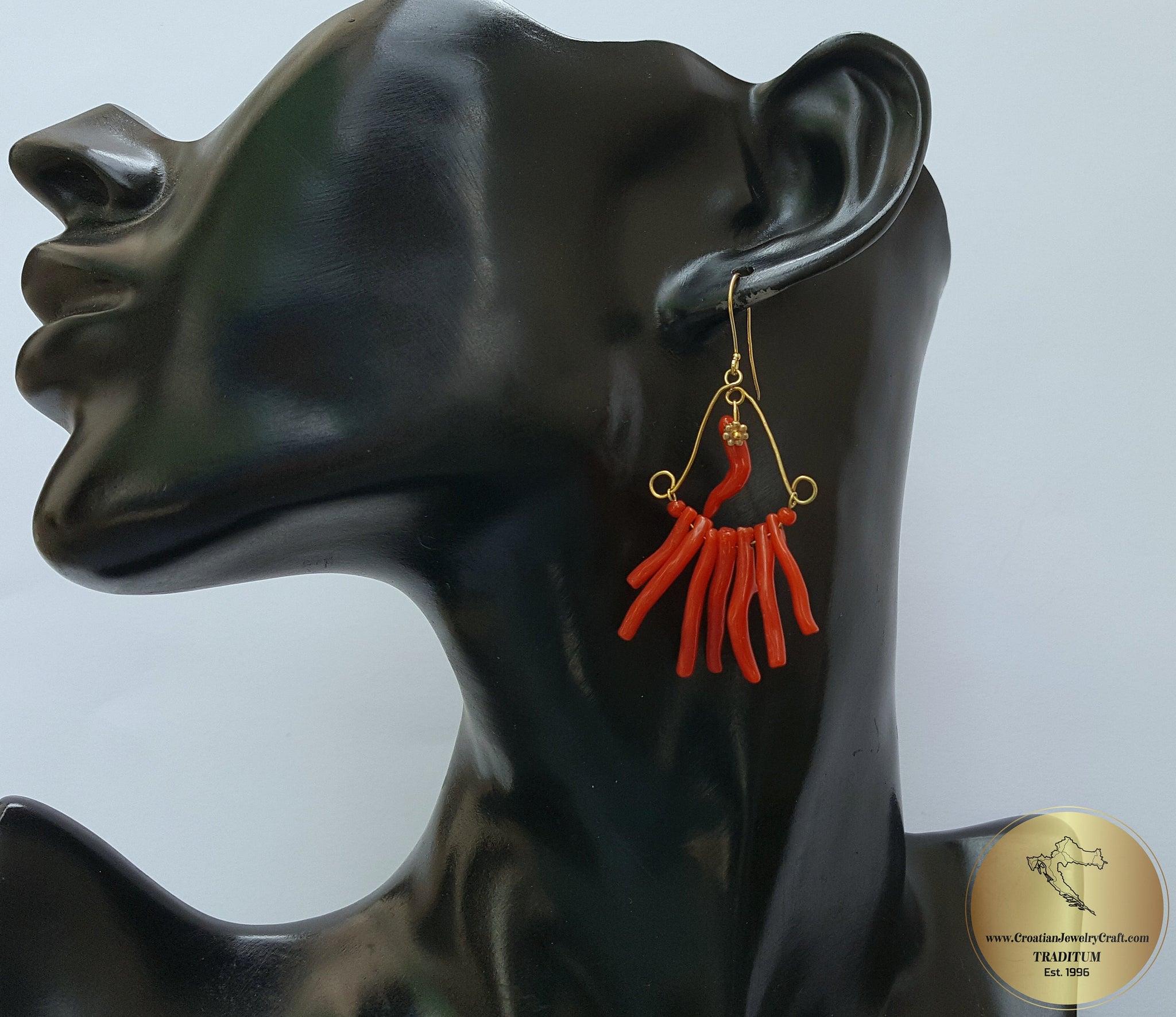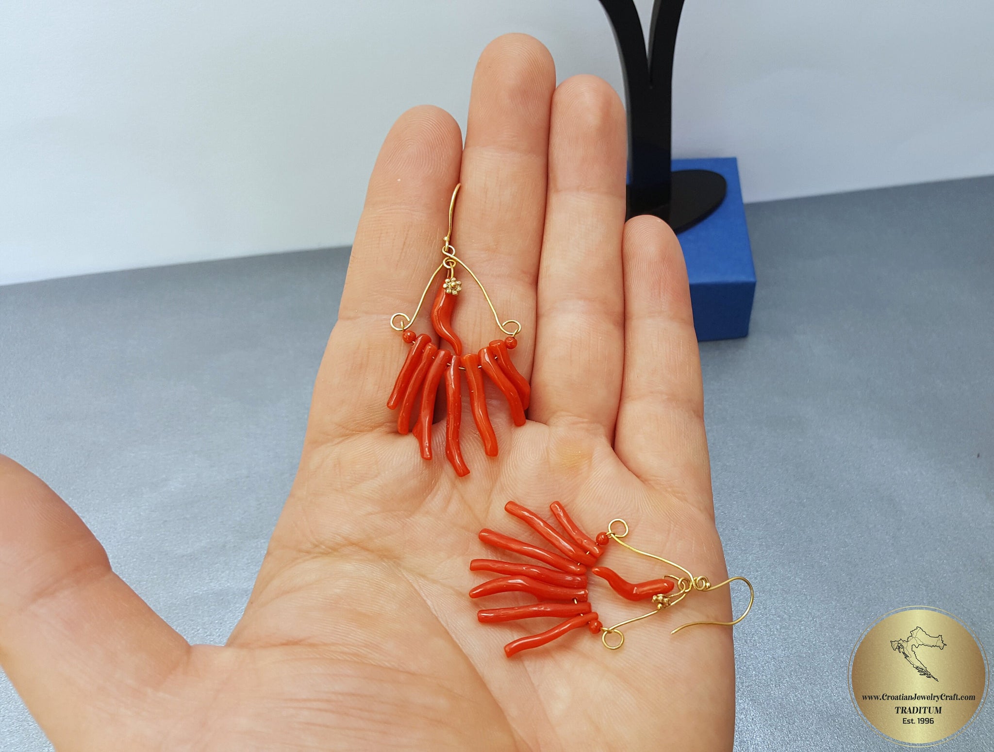 Mediterranean Red Coral Branch Earrings, Solid 14k Gold Statement Earrings, One of a kind Chandelier Earrings, Handcrafted Bridal Earring