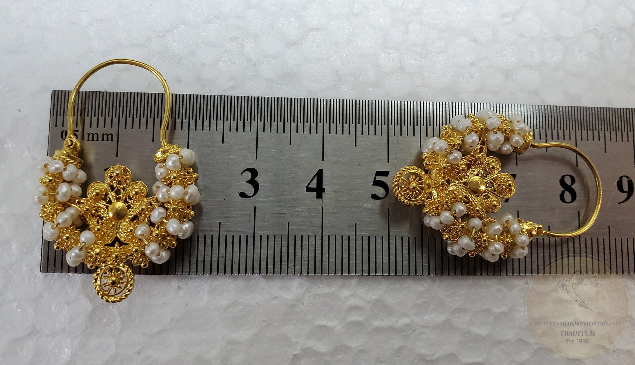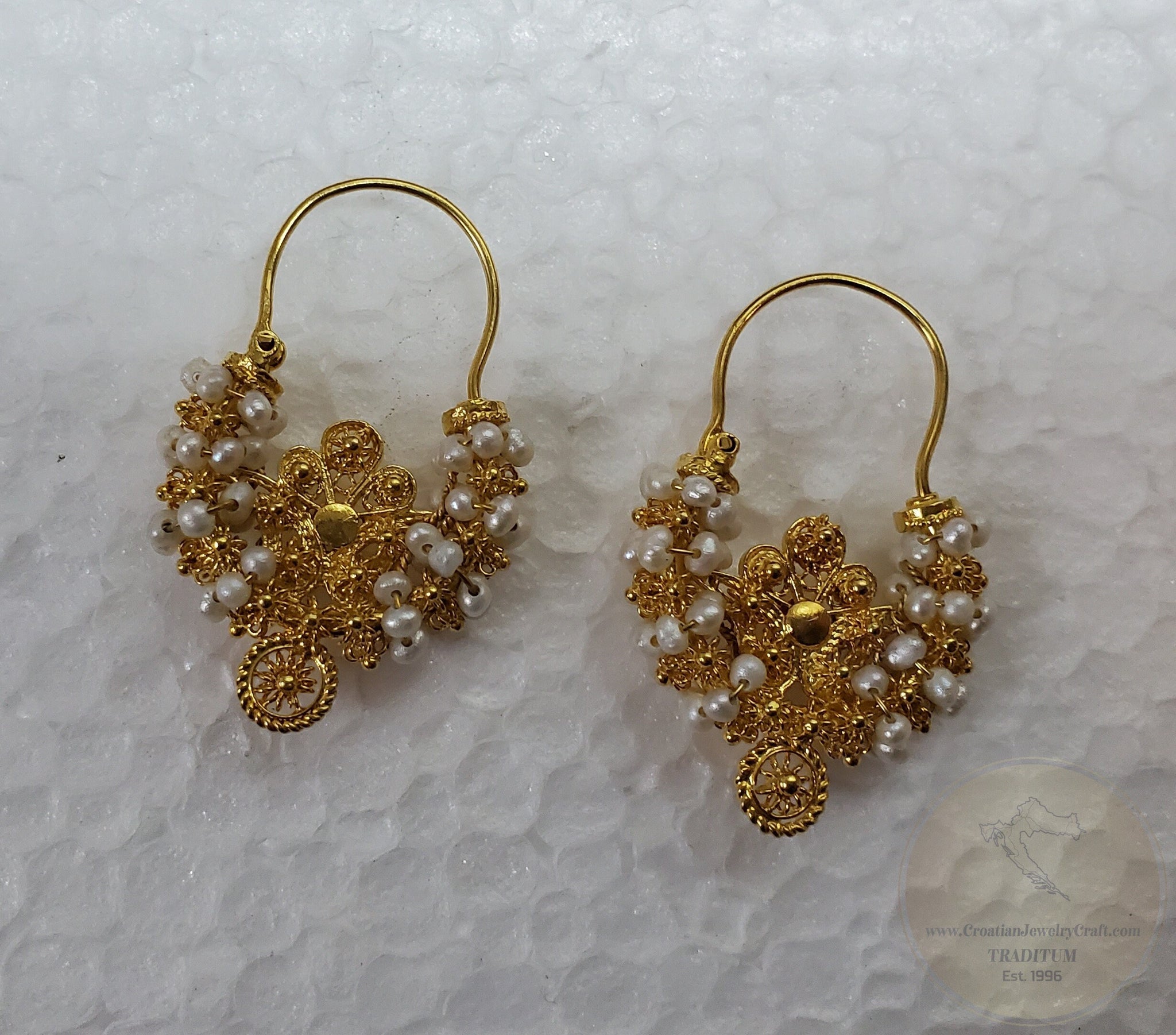 Traditional Croatian Solid Gold Hoop Earrings 14k, Dalmatian Wedding Jewelry - Recine, 14k Gold Filigree Hoops, White Pearl Dangle Hoops