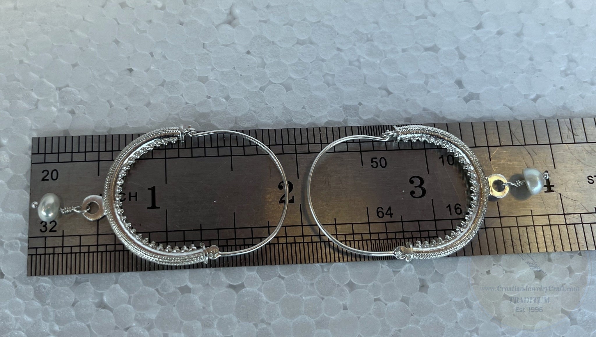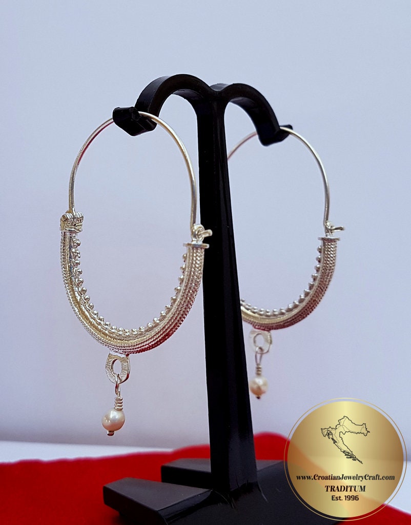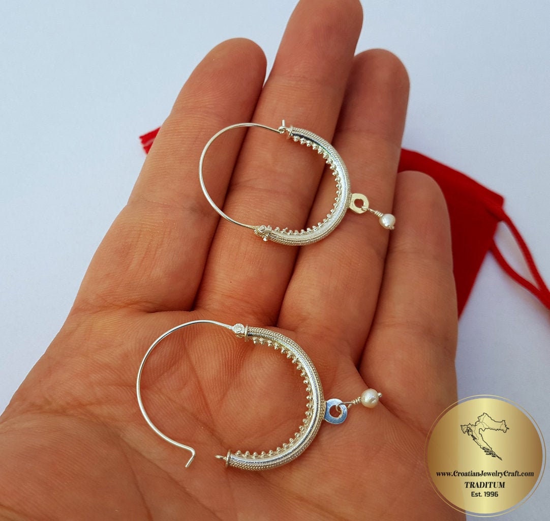 Croatian Hoop Earrings, Sterling Silver Filigree Hoops, White Pearl Dangle Hoops, Konavle Earrings, Dubrovnik Jewelry, Wedding Jewelry