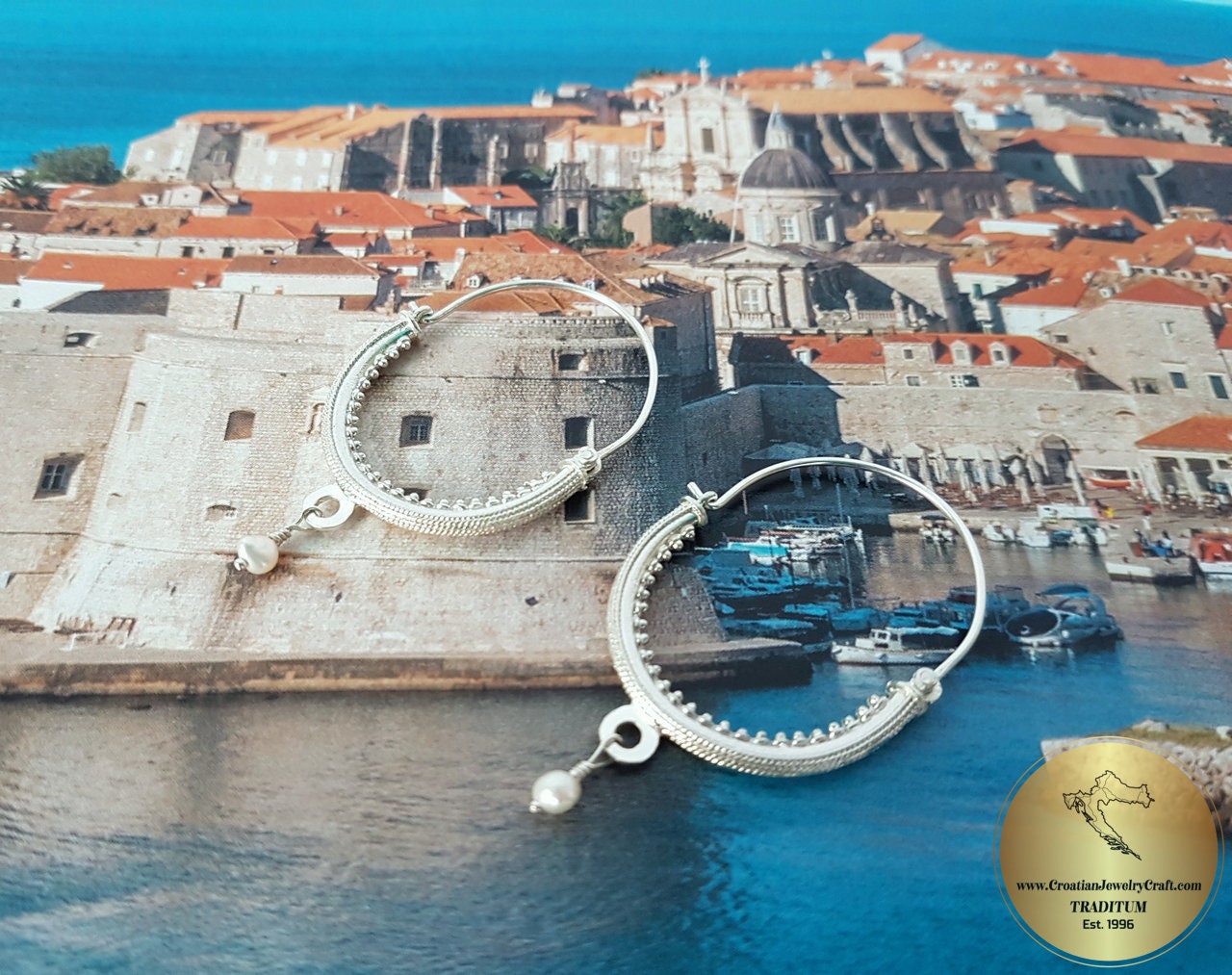 ★ Dubrovnik "Konavle" filigree hoop earrings. Replicas of traditional Dubrovnik jewelry from the 19th century - Croatian ethnic, heritage jewelry from Konavle region. Adorned with baroque-shaped natural, white freshwater pearl. Handmade from solid sterling silver. ★