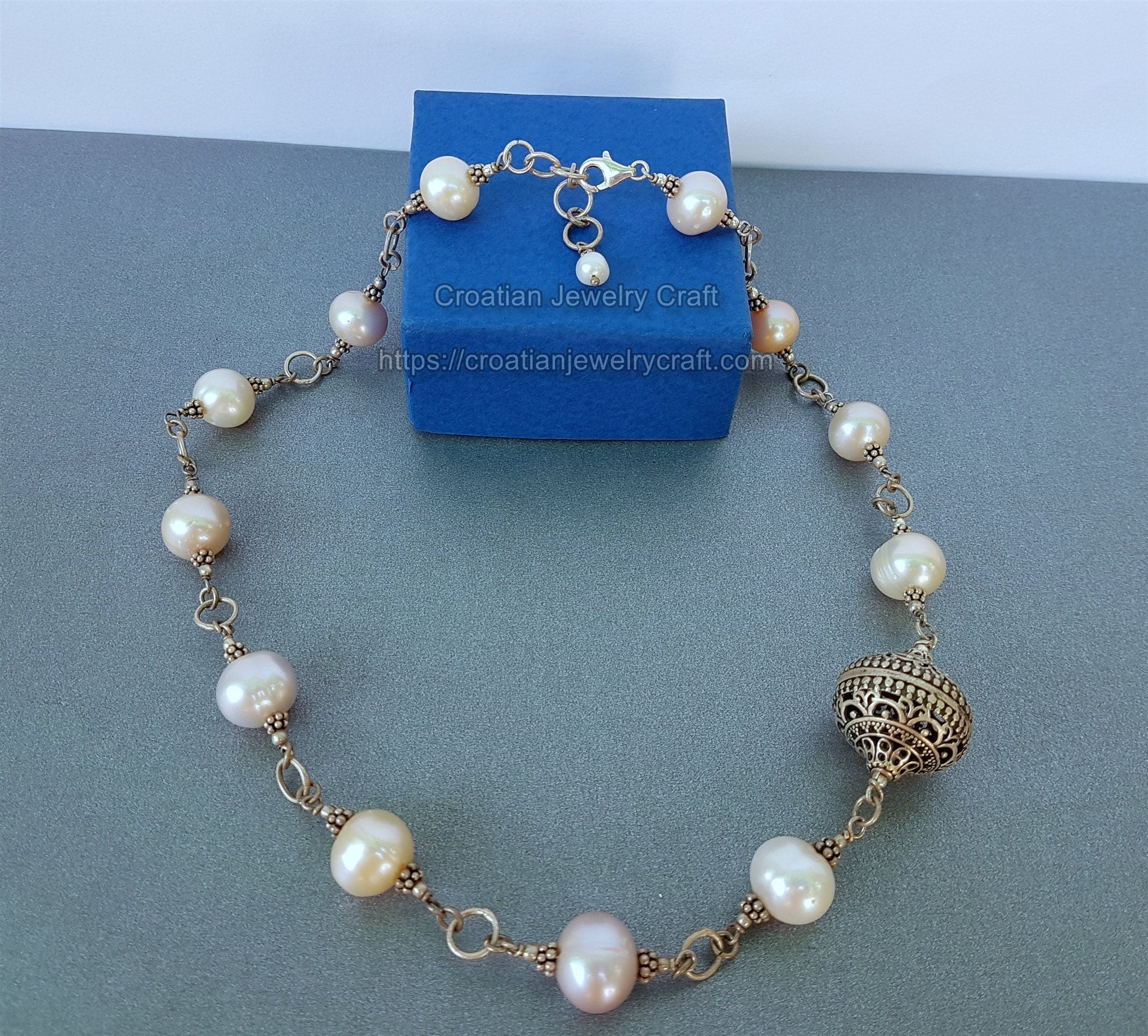 Beaded Multi Color Pearl Necklace, Freshwater Pearl Necklace, Unique Pearl Wedding Jewelry, Sterling Silver Necklace, Silver Ball Necklace