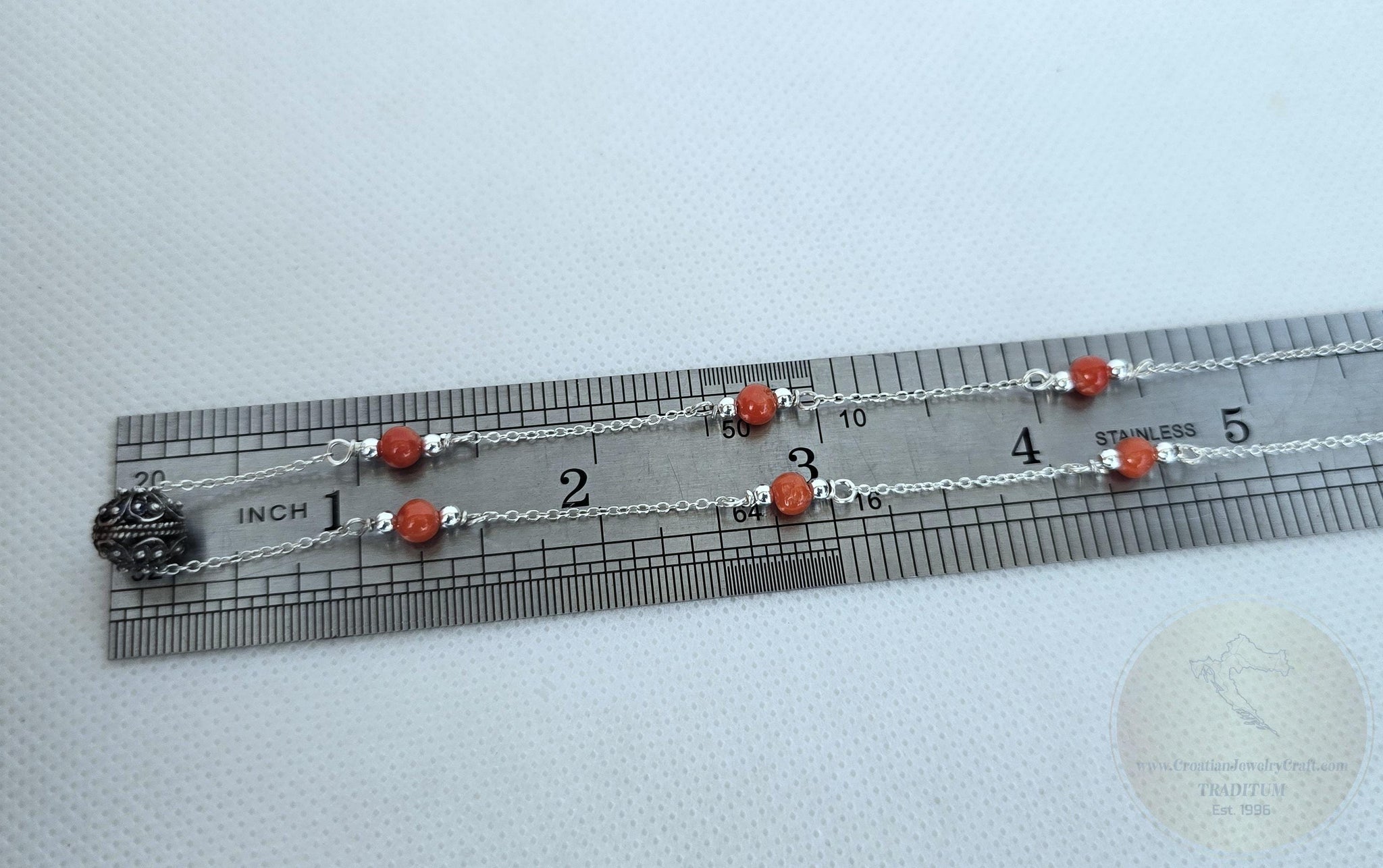 ★ Dainty chain necklace made in solid sterling silver with round beads of natural, salmon red Mediterranean coral. Adorned with Croatian filigree ball element ( replica of 19th century traditional - heritage Croatian jewelry from Dubrovnik - Dalmatia region ). ★