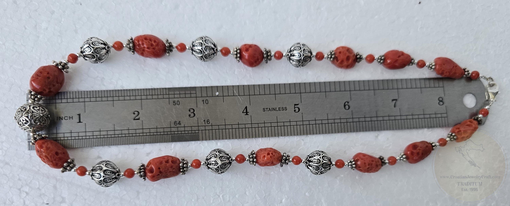 Mediterranean Coral Necklace, Salmon Red Coral Necklace, Sterling Silver Necklace, Silver Floral Ball Necklace, Natural Coral Jewelry