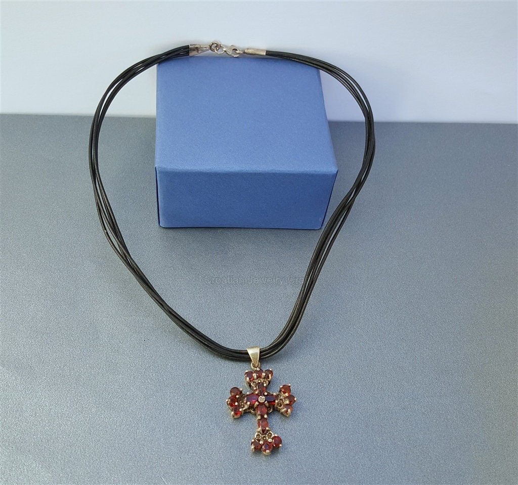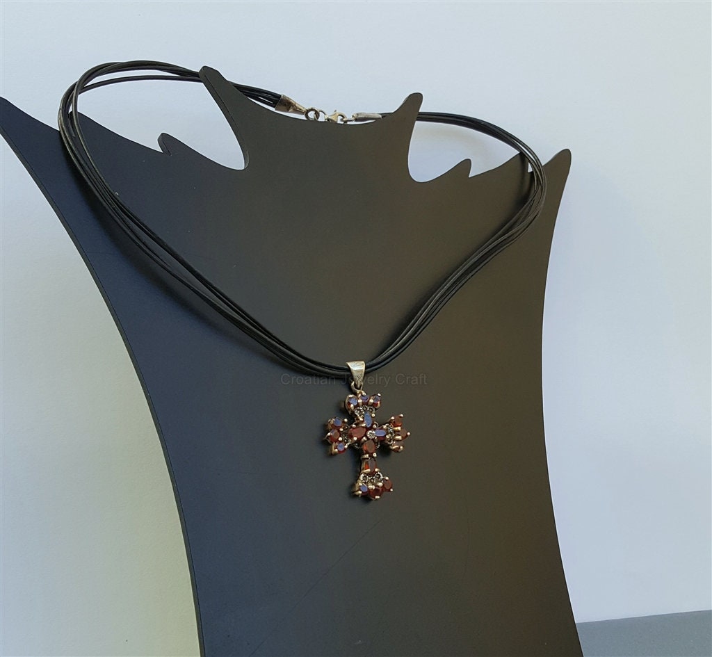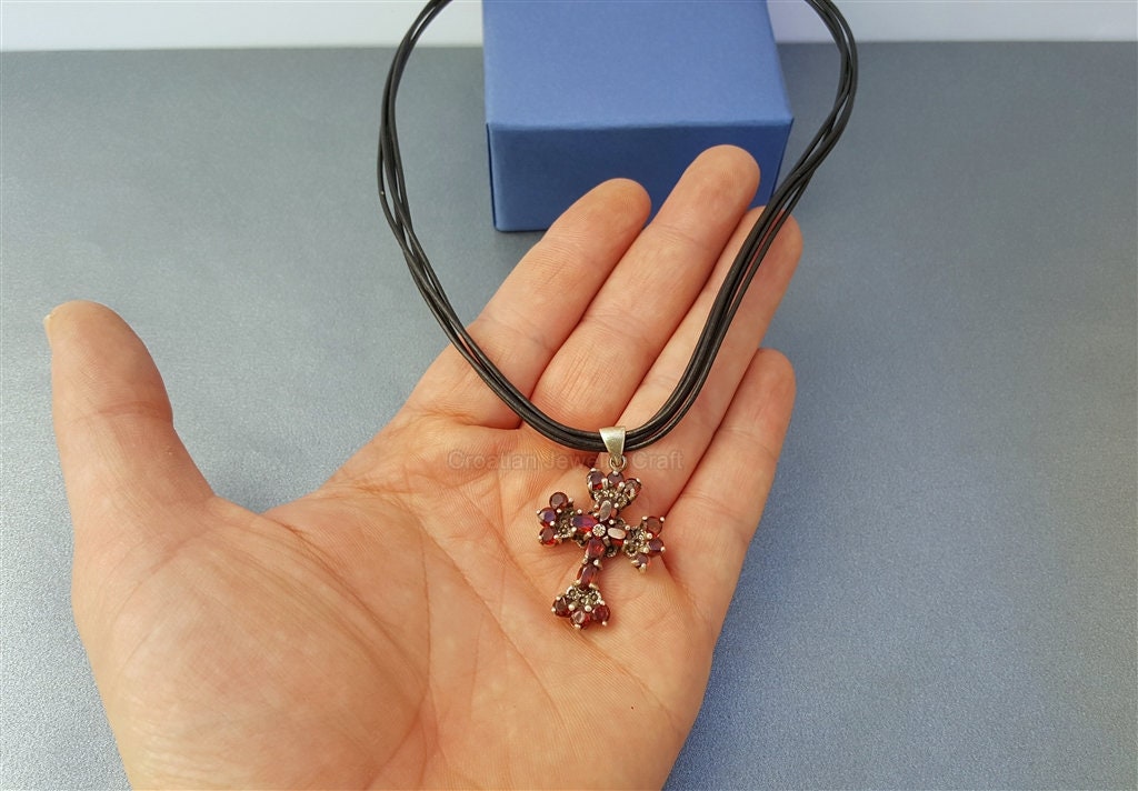 With beautiful cross pendant. Handcrafted from natural, faceted garnet gemstone, adorned with tiny Marcasite gemstones.