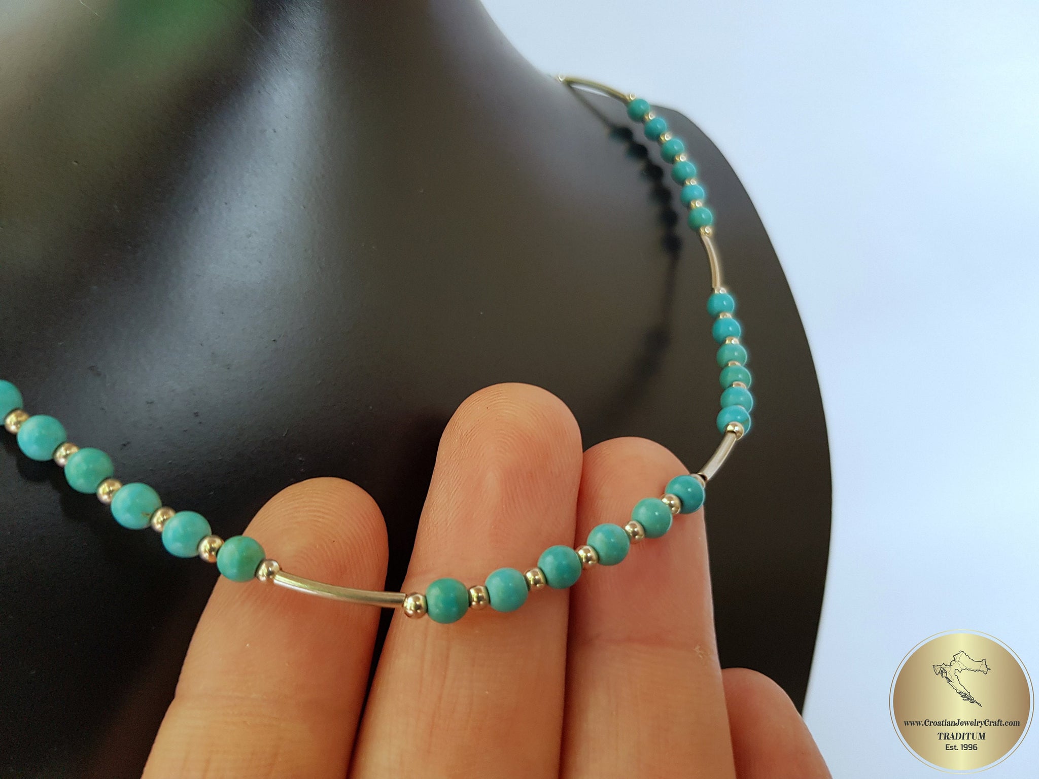 Small Bead Turquoise Necklace, Natural Gemstone Necklace, Simple and Unique Sterling Silver Necklace, Natural Turquoise Jewelry