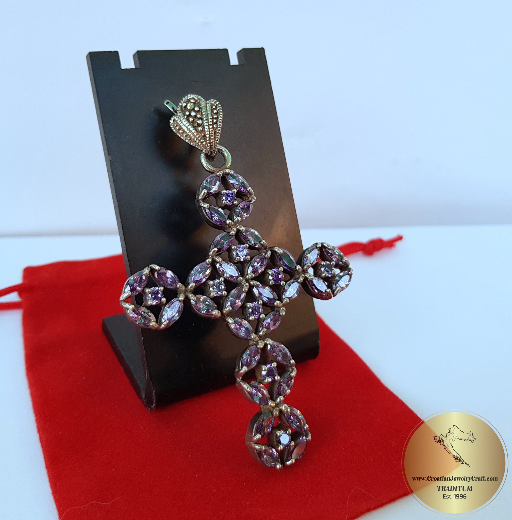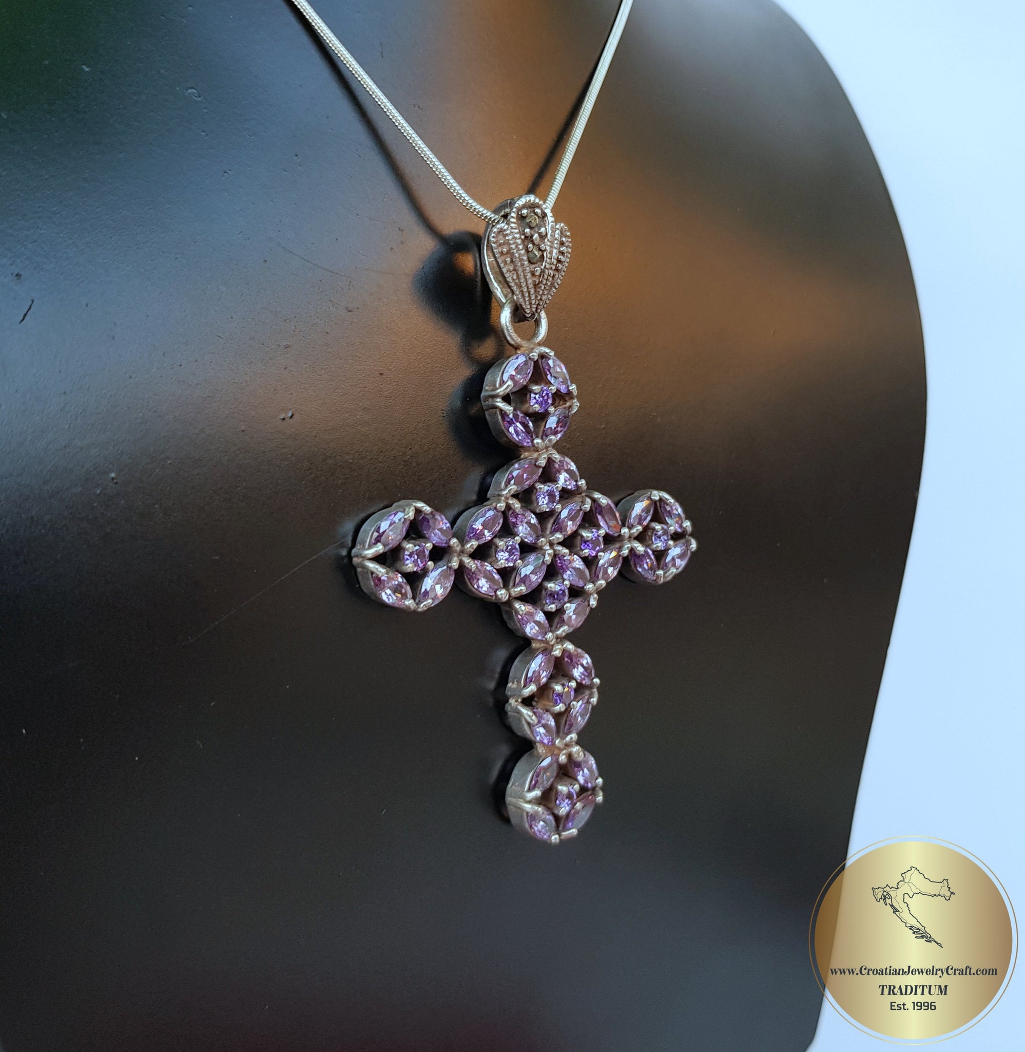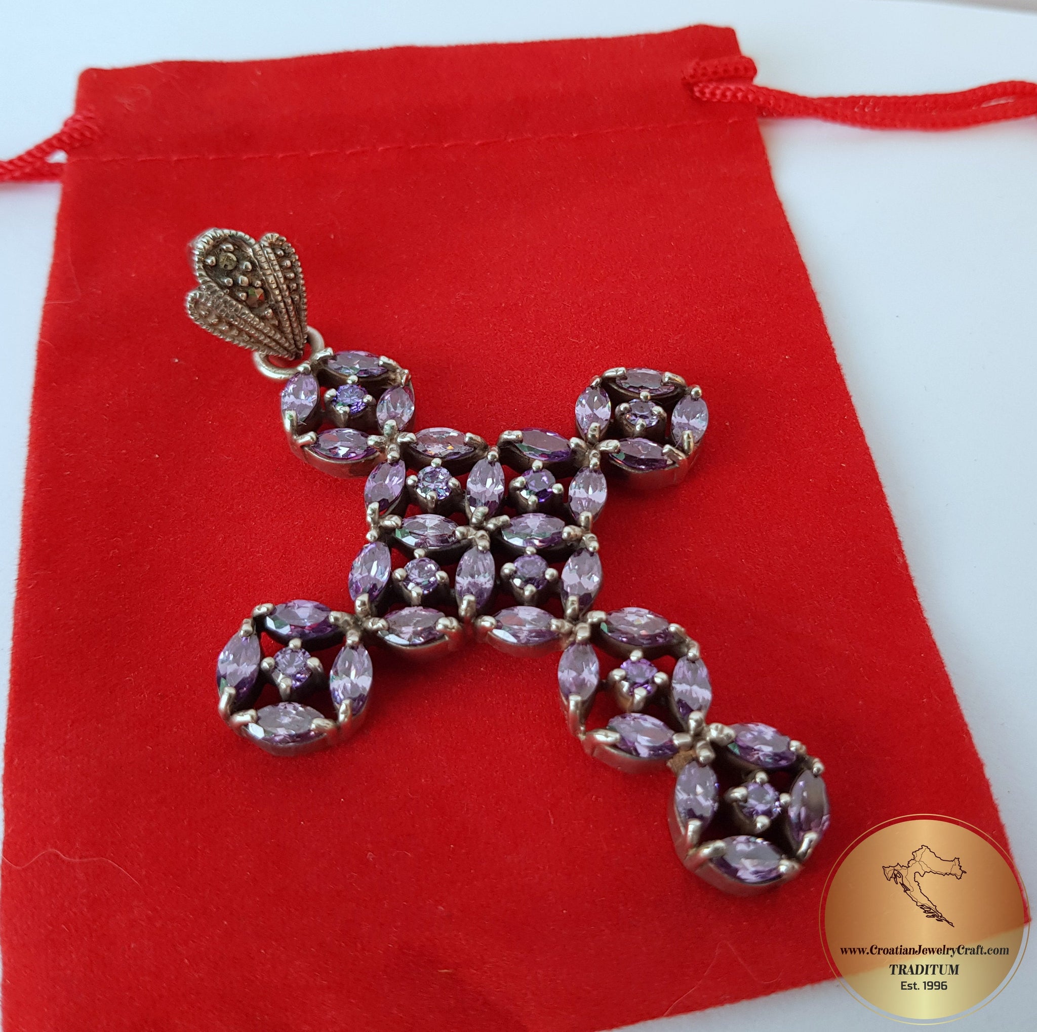 Amethyst Cross Pendant, Violet Stone Cross w Marcasite, Purple Cross, February Birthstone, Victorian Cross, Antique Style Cross, Gothic