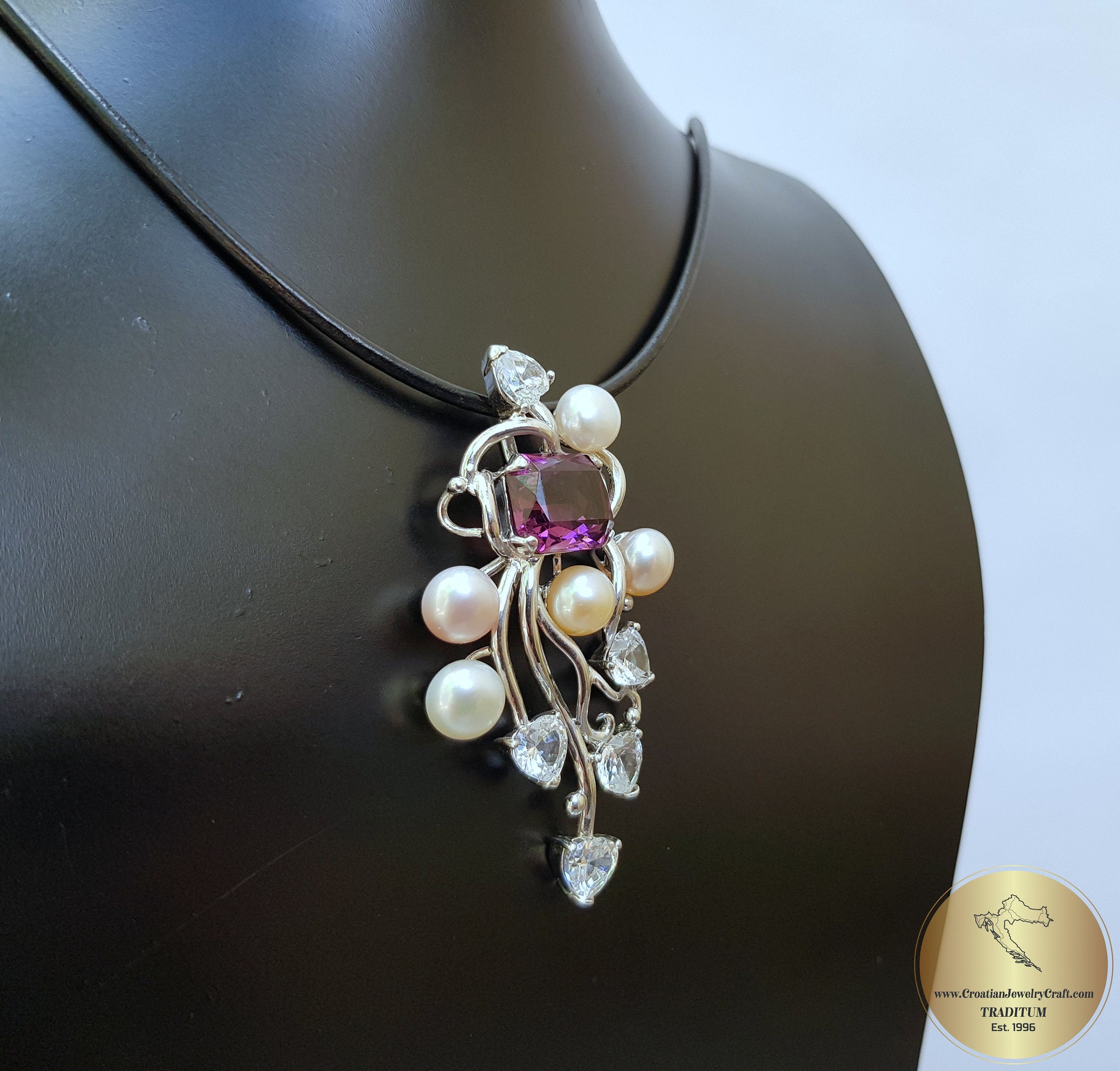 Colorful Reacme Shaped Violet Stone Pendant, Faceted Amethyst, White Topaz, Natural Multicolor Freshwater Pearl ( white, silver and peach )
