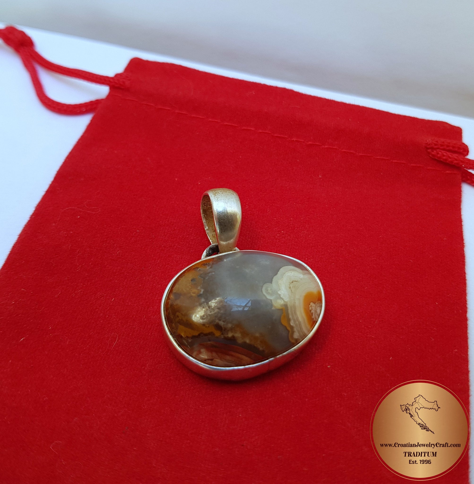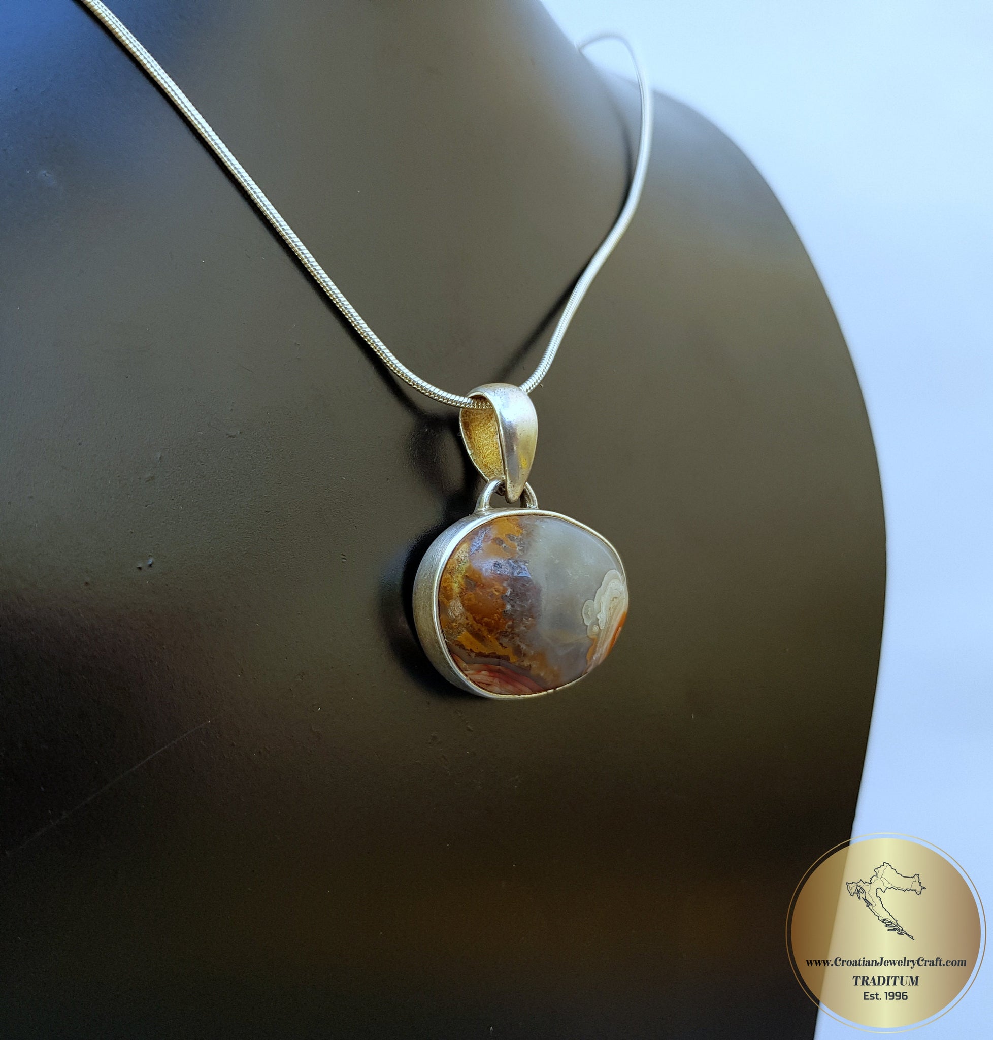 Oval Shaped Crazy Lace Agate Pendant, Sterling Silver Natural Gemstone Pendant, Handmade Jewelry