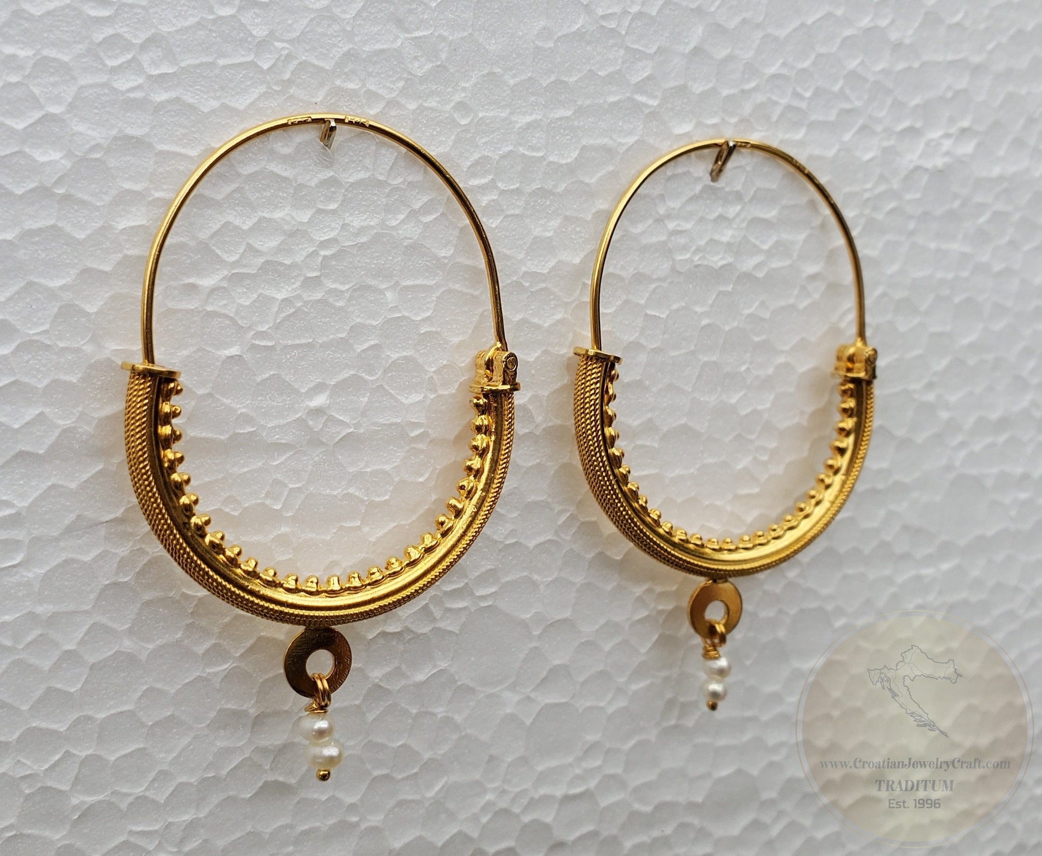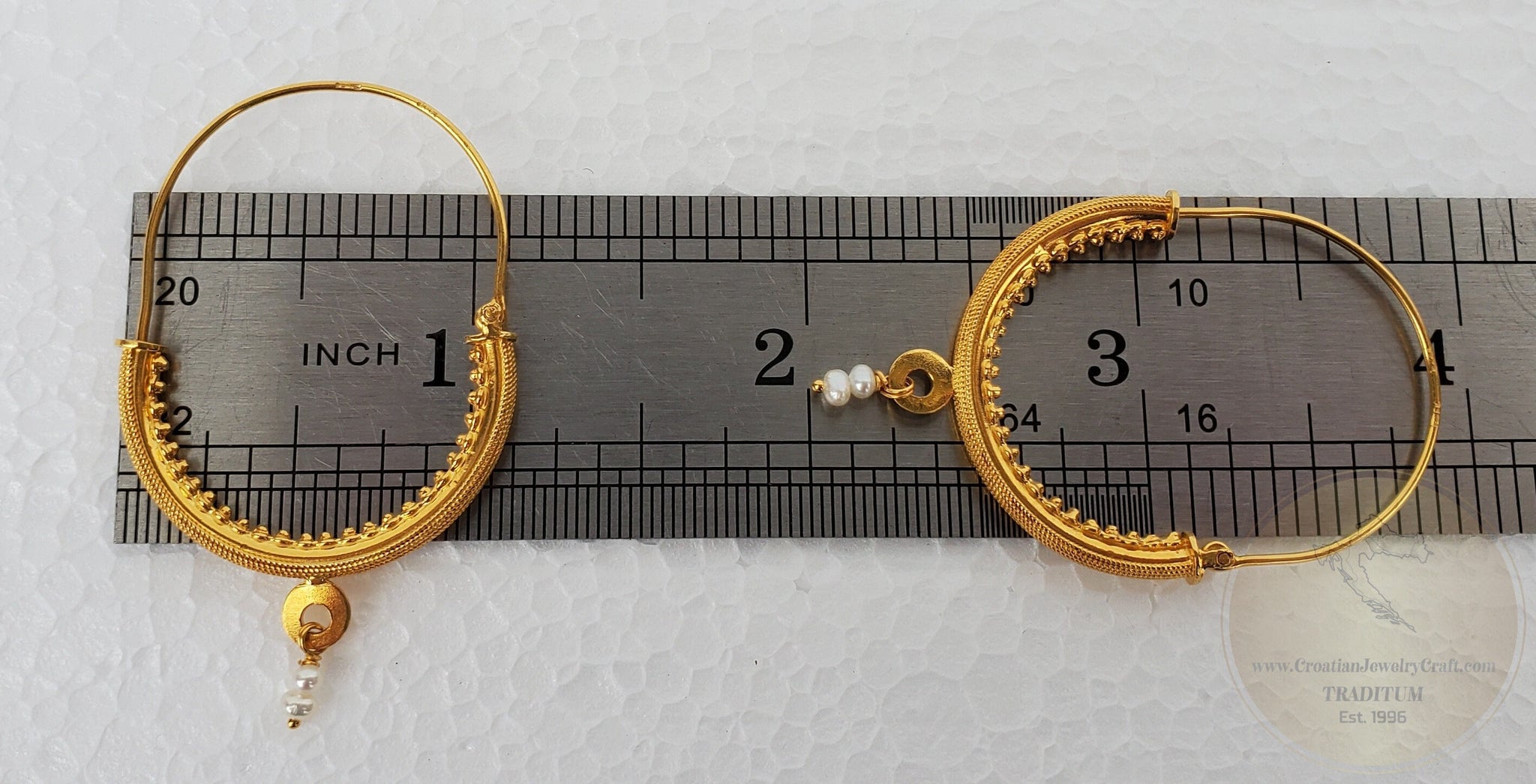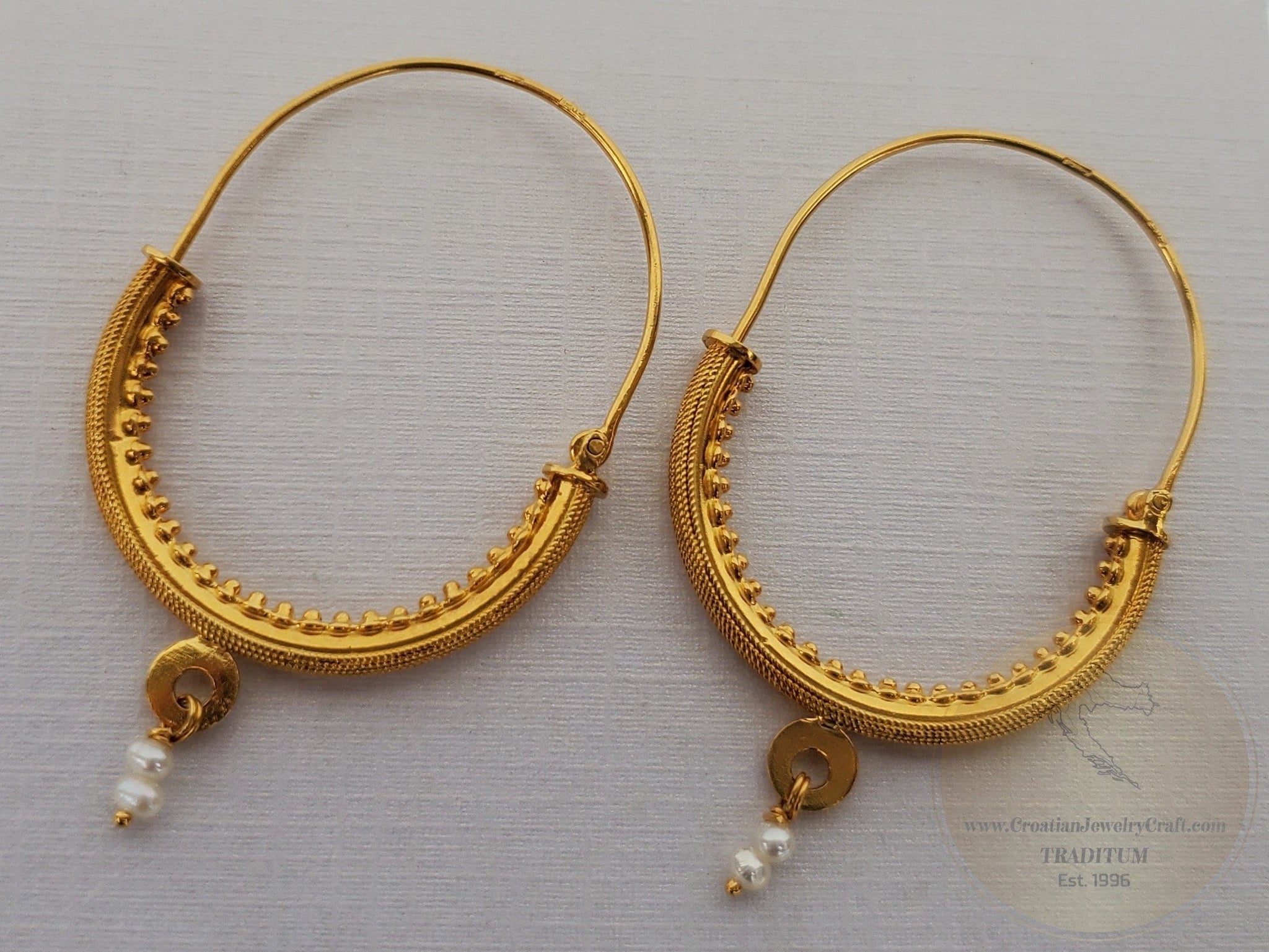 ★ Dubrovnik "Konavle" filigree hoop earrings. As worn by Queen Rania and Croatian president. True handcrafted replica of traditional Dubrovnik jewelry from the 19th century. Croatian ethnic, heritage jewelry from Dubrovnik Konavle region. Adorned with natural, white freshwater pearls. Meticulously handcrafted solid 14k gold filigree metalwork. ★