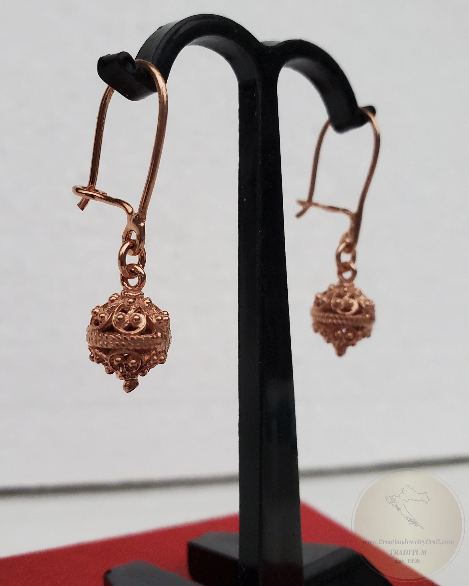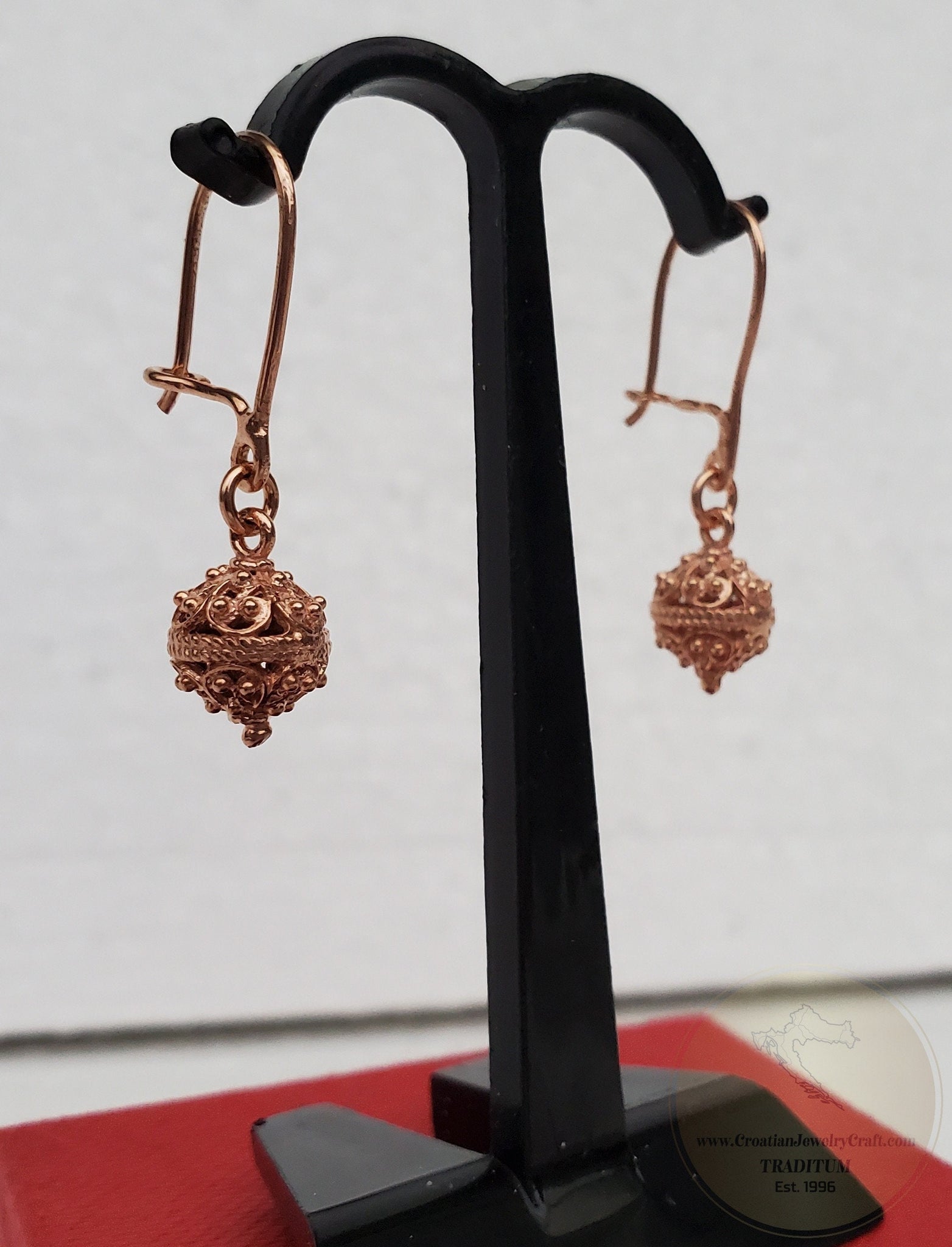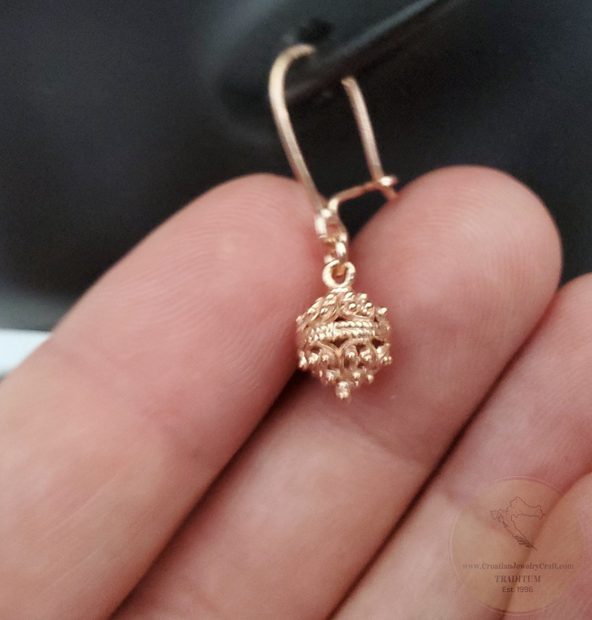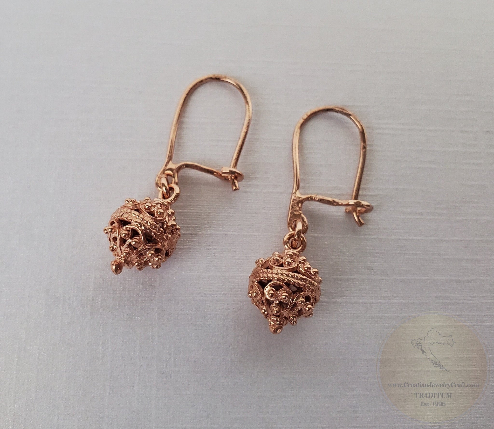 14k Rose Gold Earrings, Traditional Croatian Filigree Ball Earrings, Pink Gold Earrings, Ethnic Dubrovnik Jewelry Solid Gold Wedding Jewelry
