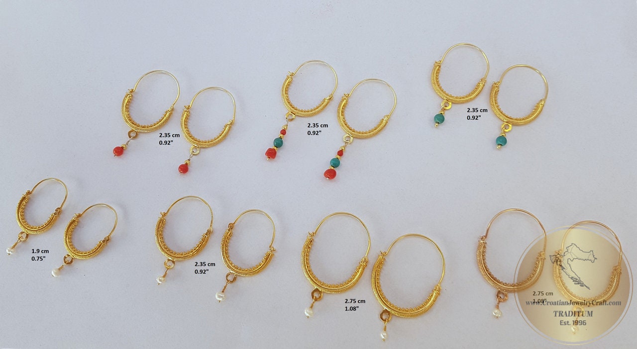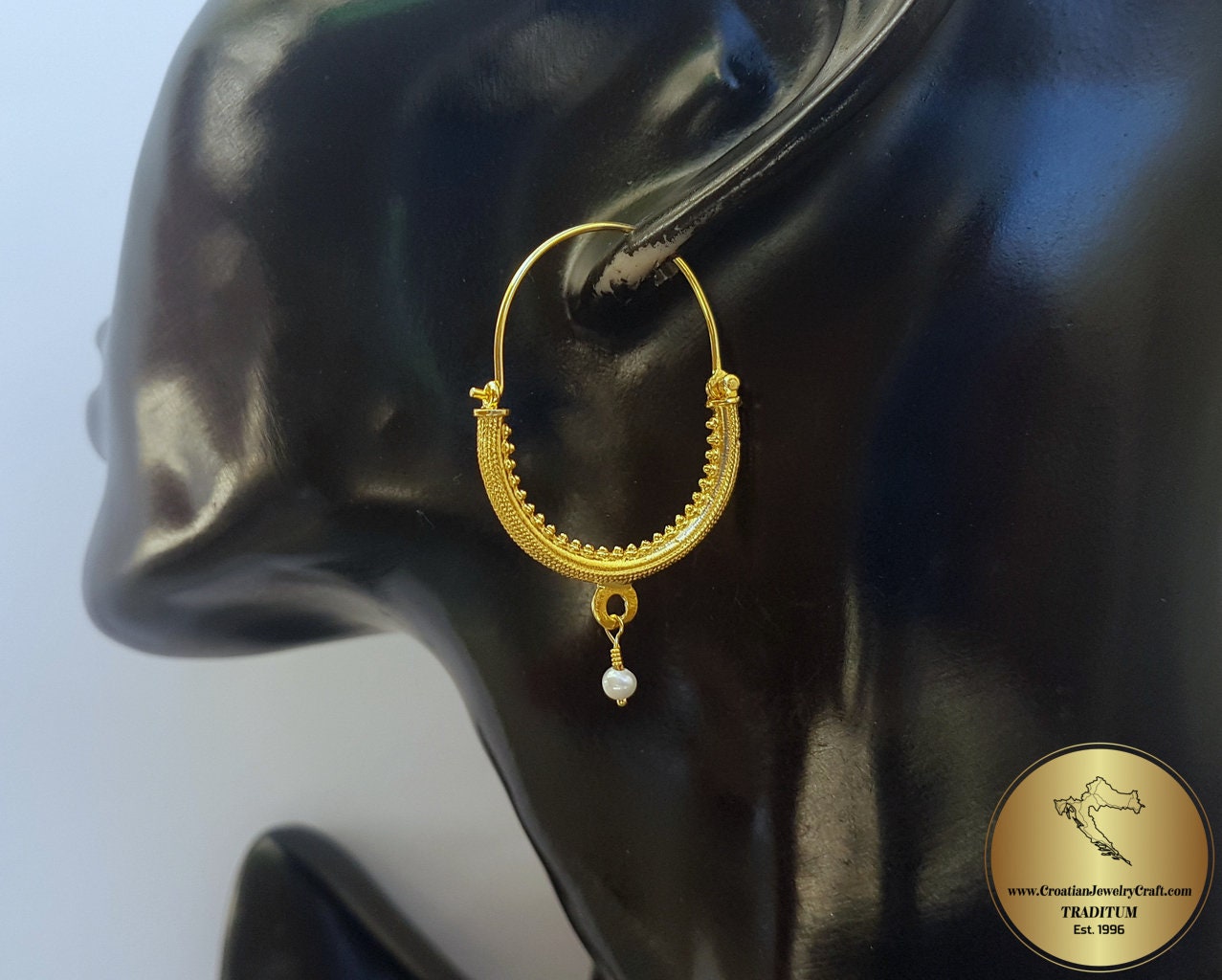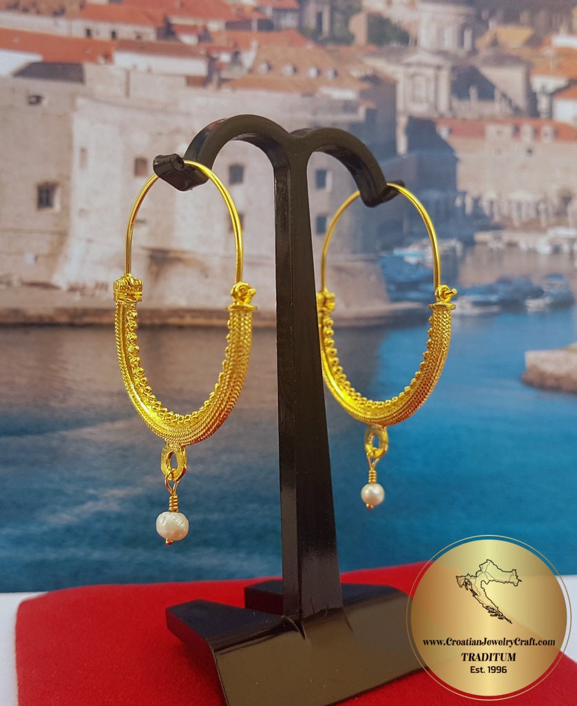 ★ Dubrovnik "Konavle" filigree hoop earrings, third size 2.75 cm ( 1.09" ) in width. Replicas of traditional Dubrovnik jewelry from the 19th century. Croatian ethnic, heritage jewelry from Konavle region. Adorned with baroque-shaped natural, white freshwater pearl. Handmade from solid sterling silver, which is plated with 24 k gold. ★