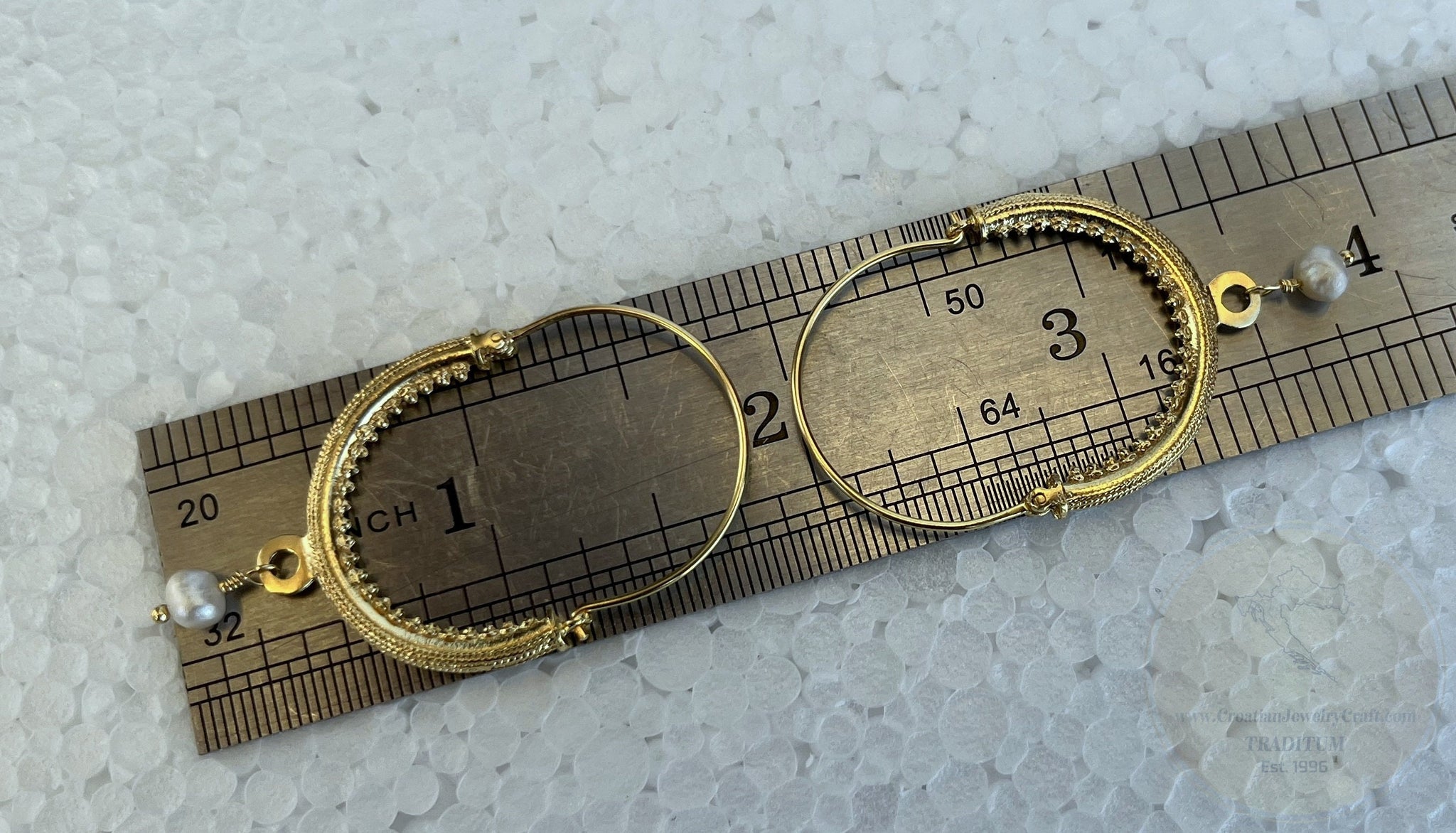 Croatian Filigree Hoop Earrings, Gold Plated Hoop Earrings, Pearl Dangle Hoops, Wedding Earrings, 24k Gold Plated Sterling Silver Earrings